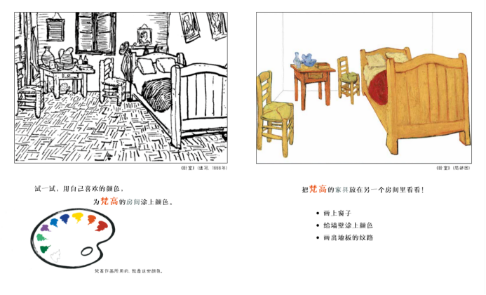 比如在介绍完梵高《卧室》的布置和色彩后,让小朋友来重新上色,用家具重新装饰房间: