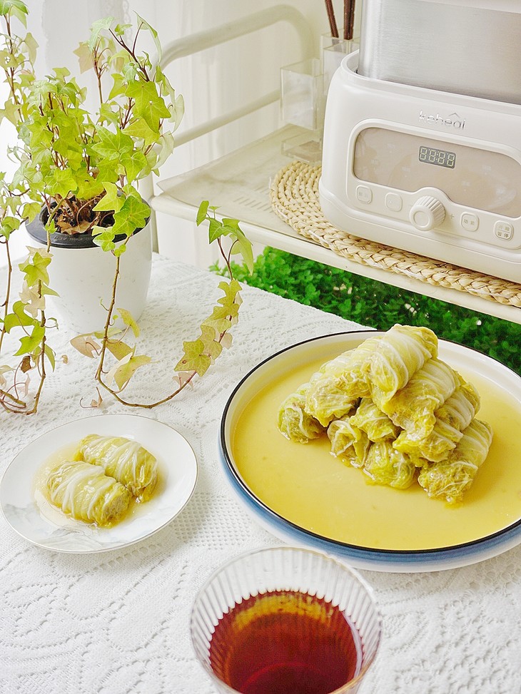 3、将调好的肉馅放入白菜中间,卷起来,放入盘 中。