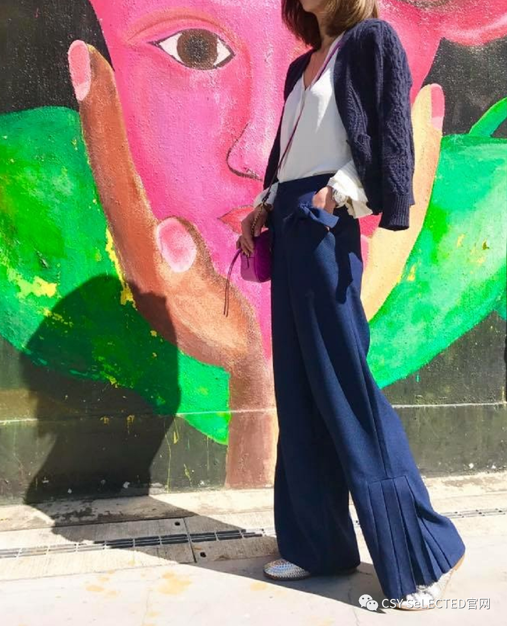 深蓝色长裤会比黑色更百搭,球鞋、高根甚至配刚到手的新款ankle boots 也很适合,上身能配V领毛衫,亦能配白tee, 上班族加上西装外套便可快速出门,这样的单品,在忽冷忽热的初秋最亲民最能随心搭配。