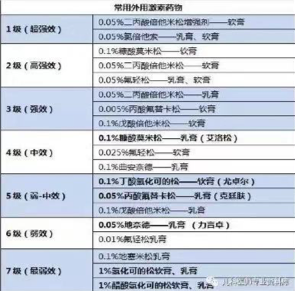 激素药膏的选择建议是从弱效激素药膏开始,症状无法控制再改为中效激素药膏。面部或眼周湿疹,建议用弱效激素药膏,可以参考下图👇