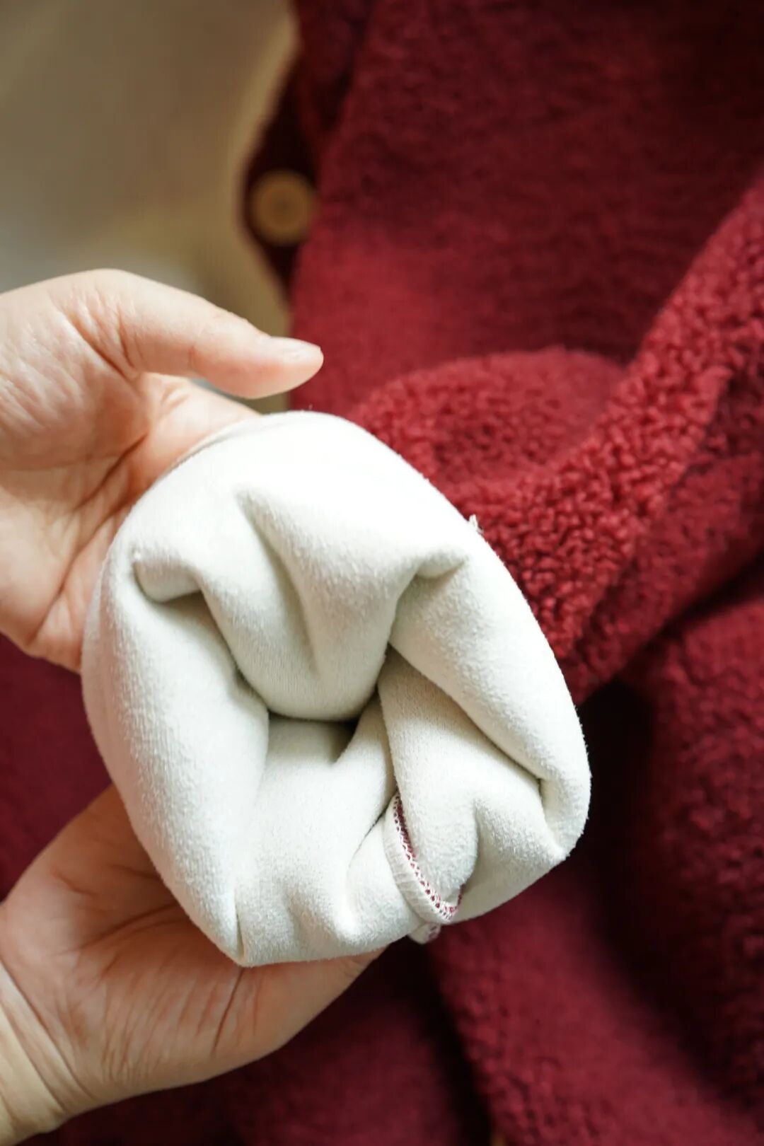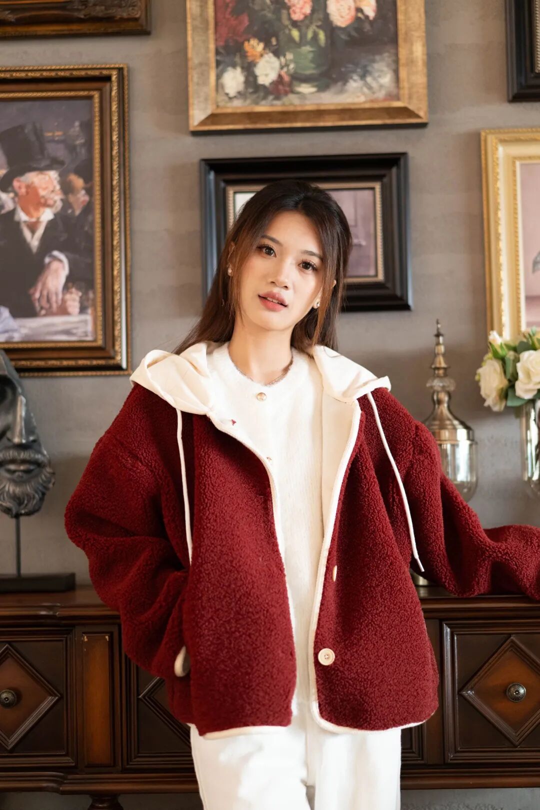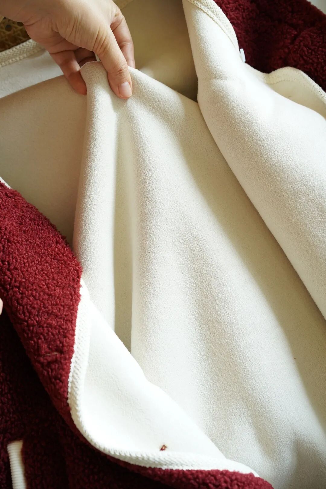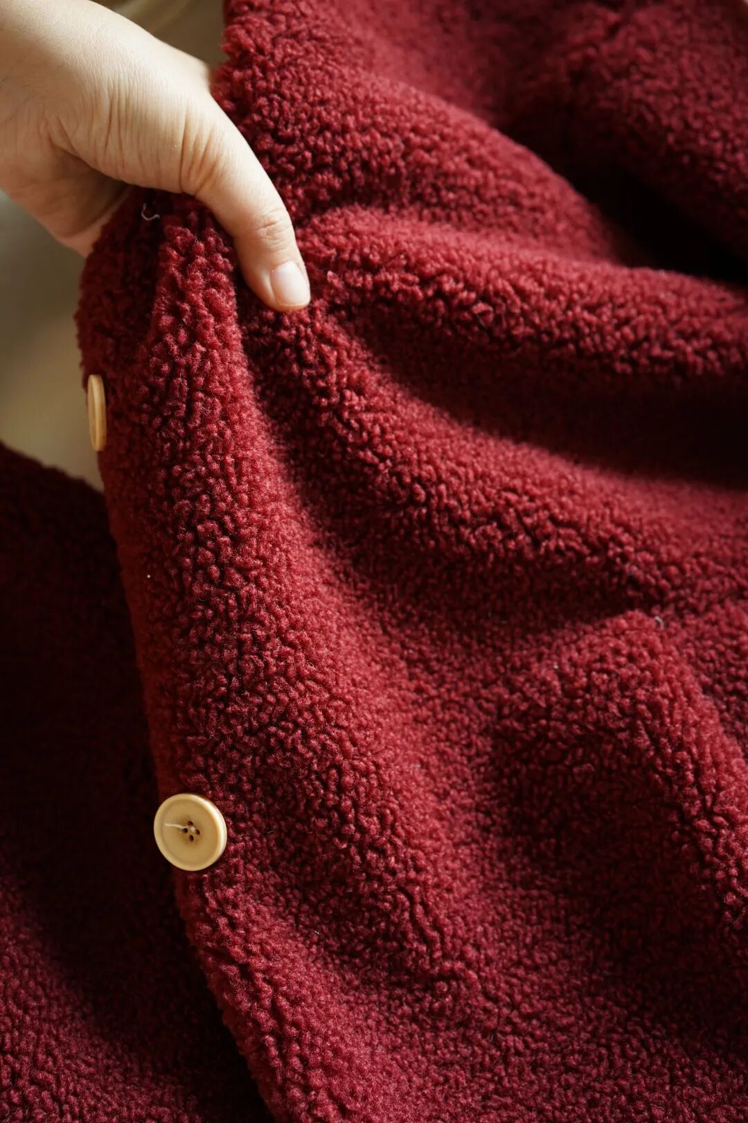 不是张扬的艳红,是揉进了绒感里的“醇厚复古红”,像浸了冬日暖意的丝绒,在暖光下泛着柔和的哑光。
