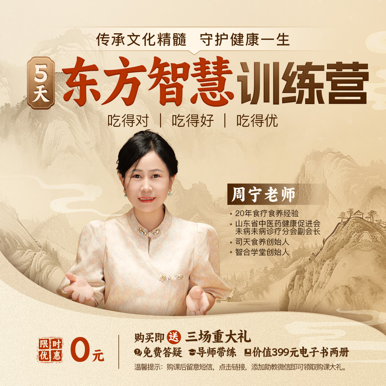 这也意味着无论是现在、未来,普通人学养生知识调理身体状况已成趋势。因此,我们特别邀请到了国家高级营养师、20年食疗食养经验——周宁,来为大家带来2025年全新升级版《5天智慧饮食训练营》,现招募200人线上学习体验。不限学历,不限地域,不用集赞转发,只要你热爱养生,希望用科学养生知识来改善身体素质,直接扫码学习。名额珍贵,限时学习5天,仅需0元!报名人满将立刻关闭通道。1、课程内容:5天直播课程,全程只需0元,让你从什么都不懂,到能自我调理身体不适