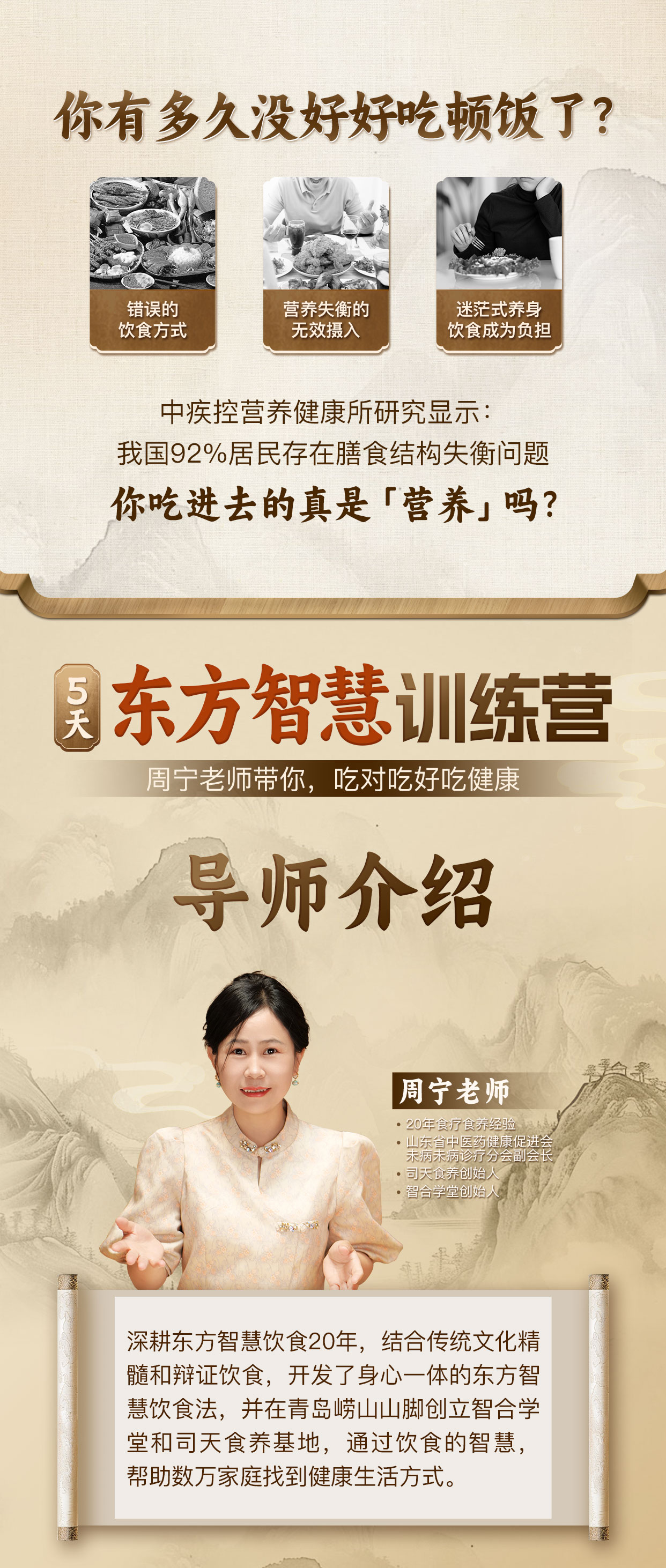 3、适合0基础:课程由理论到实践,适合零基础入门的中老年人,并结合实际案例,来解答身体健康问题。并且和国人的饮食体系相结合,日常吃饭照着做就可以了。4、专业机构授课:由专业营养团队带领,针对性提供营养食疗方案,并且学习中遇到的问题都为你解答。学习方式:线上学习,手机/平板/电脑均可,不耽误个人生活、工作招生时间:5天内关闭报名通道,需要的朋友抓紧时间。周宁是国家高级营养师,“20年食疗食养经验”。在她多年的营养食疗教学过程中,以黄帝内经为根本,了解学员的五行体质,帮学员定制膳食食谱。周宁苦心钻研多年,线上线下授课近千场,自成体系,将养生食疗教学知识简单化,生活化,大众化。3天的讲堂中,她会把日常饮食和身材的关系、饮食和身体糖分、脂肪的关系、食疗知识错误和正确的方式,全都告之于你。打造的是纯碎的养生食疗学习环境,里面只讨论养生知识、探讨身体不适情况,和志同道合的朋友共同进步。我们常说,人在年轻的时候是用健康换钱,而中年则变成了用钱来换健康。但现实往往更残酷,就算花费大把的钞票去买健康也未必能办到,除非你找到正确的老师,给你量身定制适合你的养生食疗方式。