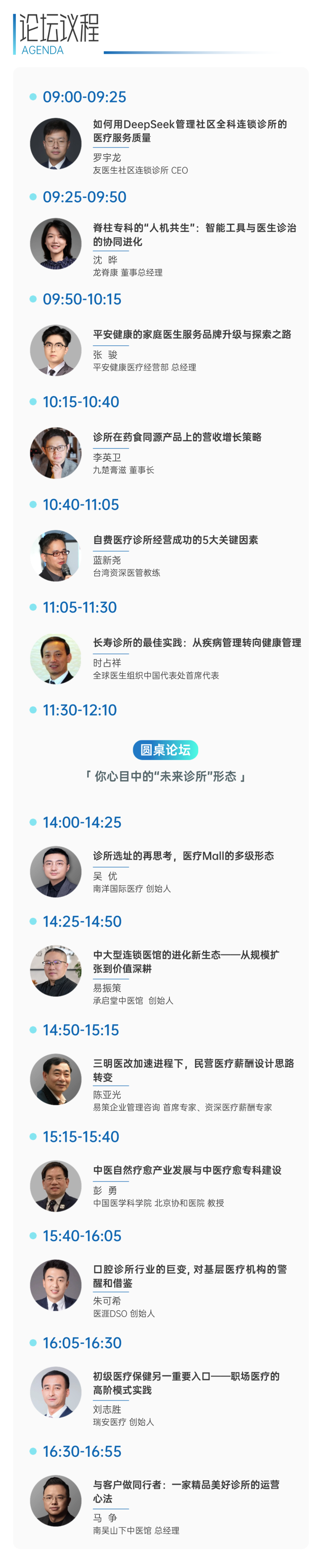 过去十年,诊所净增约13万家,基层医疗机构年就诊人次也增长近10亿人次!过去十年,是诊所发展的红利期。当下,诊所行业依旧在快速增长期,近一年诊所(含门诊部)新注册约4万家,但也伴随着激烈的竞争演变,过去3年成立后又注销的诊所也达到4万家,十年内成立又注销的诊所也达到近15万家,淘汰近二分之一。诊所虽小,但过去几年却扎实给很多步入的资本巨头和新人上了一课,做诊所需要用心、用情、用时间培育和养护。我们眼下正经历着行业的阵痛与激烈演变,这一刻危与机并存。未来随着老龄化加剧,分级诊疗的持续推进,我们借鉴邻国日本1.25亿人口有10.5万家基层诊所,且承担近80%的首诊任务,诊锁界判断未来到2030年基层诊所机构数量有可能达到50万家,基层诊疗人次也有望达到60亿人次。未来老龄化加剧,健康需求进一步释放这是确定性因素,但另一方面伴随着医改的持续推进、居民对基层医疗更高质量的期待、AI等新技术的快速迭代应用,诊所正迎来全新的发展机遇与挑战。行业变革也正在迎来加速,未来诊所的形态其内涵与外延正在不断进化与升级。未来诊所到底是怎样的形态?我们诊所人该以怎样的改变来回应人们对美好基层医疗的更高期待和多元化需求,该怎样做好新时代健康守门人的角色?消费降级,消费紧缩什么样的诊所才能获得更久,更具有竞争力?这是眼下所有诊所人的必答题。可以肯定的是未来基层医疗仍是增量行业,但诊所功能将不再仅仅局限于看病检查开药这种传统的诊疗模式,盈利模式也不再是赚药品差价。而是逐步在AI、智能化系统的协作下,从疾病诊疗延伸到帮助患者身心健康的生活,盈利模式也从赚疾病的钱转向赚健康的钱。诊所的形态将更加的丰富与多元化,与智能化工具将结合得更加紧密,医改背景下严肃医疗微利化趋势,步出体制做诊所的医生人才将进一步丰富,大型连锁诊所品牌或将进一步做大做强。我们特邀了不同形态的基层医疗机构的代表,从不同维度给大家描绘未来诊所的形态、机遇与挑战。◎大会名称:2025中国诊博会——未来诊所发展大会
