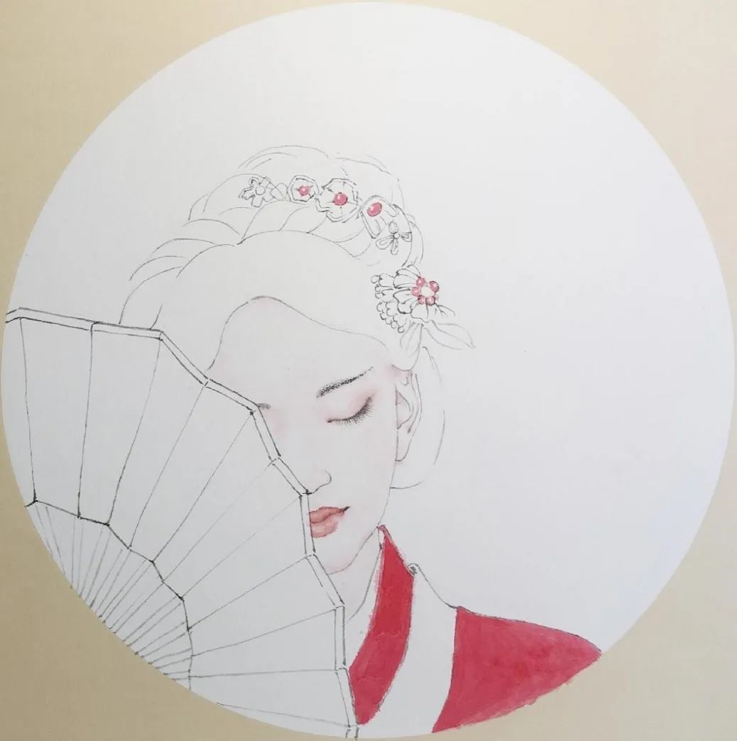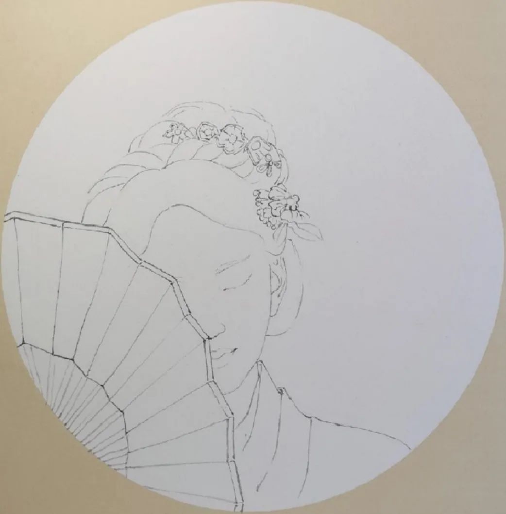 第一步:根据构思画出线稿。画人物面部五官的时候,要注意最基本的比例位置和结构。用笔要注意提案转折,线条有粗细虚实之分。折扇及衣饰造型要简练概括,线条要有虚实变化。