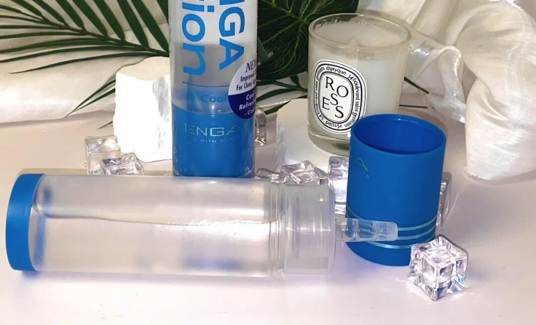 TENGA冰感润滑油采用了冰蓝色包装与磨砂圆柱体瓶身设计,视觉上便给人降温的感觉。