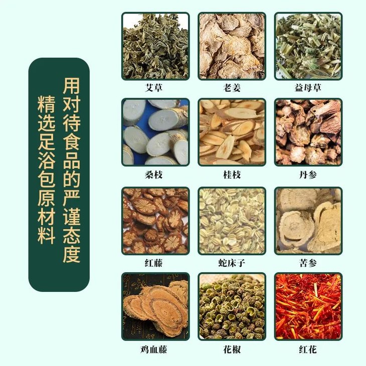 艾叶有温经散寒、祛湿暖宫的功效;老姜、桂枝、蛇床子有助于温阳散寒;益母草、丹参、红花可强化活血通经之效;红藤、鸡血藤可理气行血;桑枝利关节,可祛风湿;苦参、花椒则辅助燥湿、杀虫、止痒。