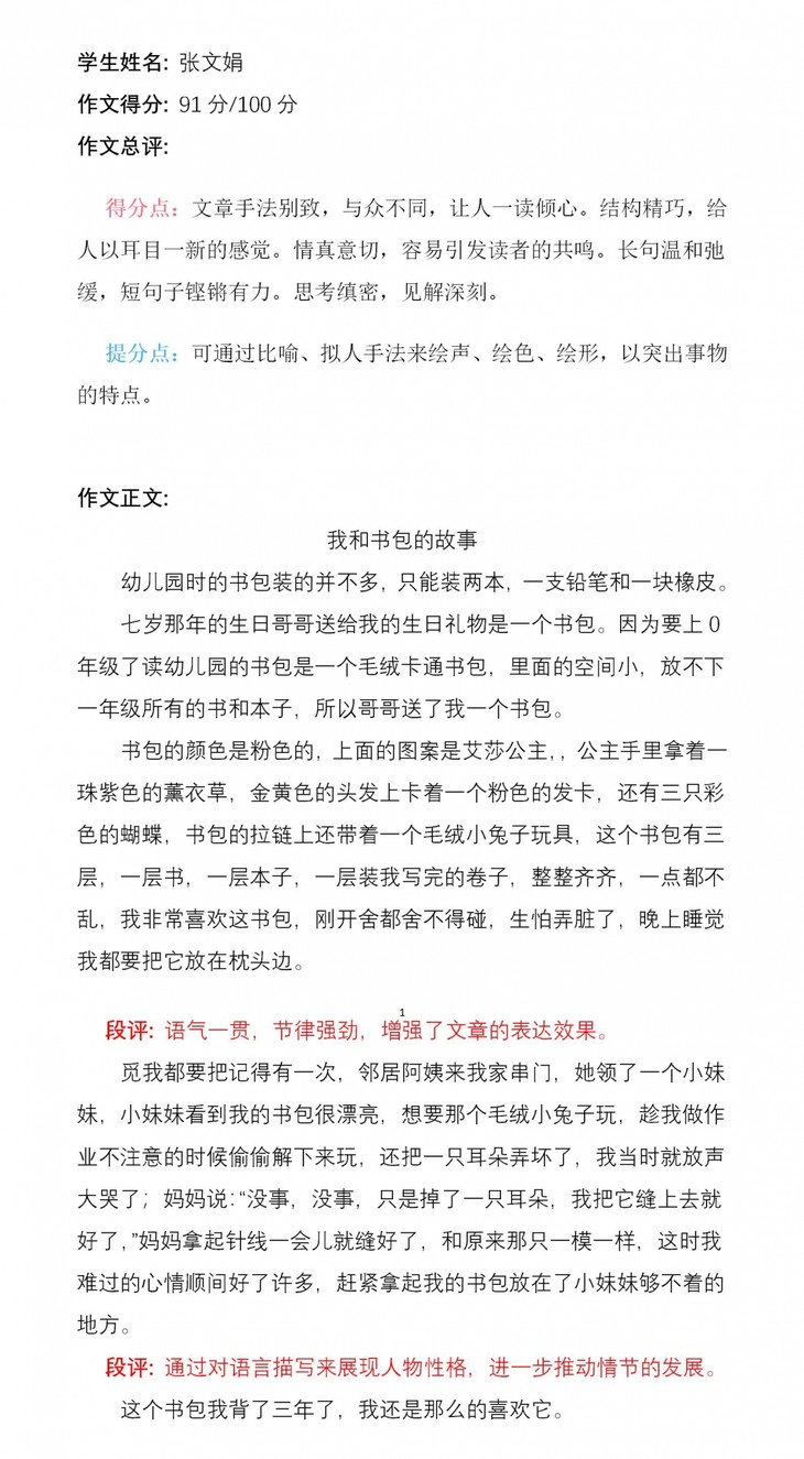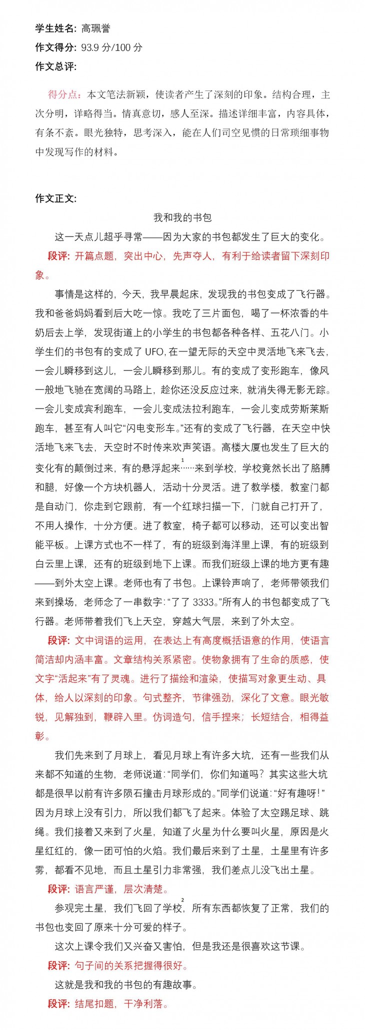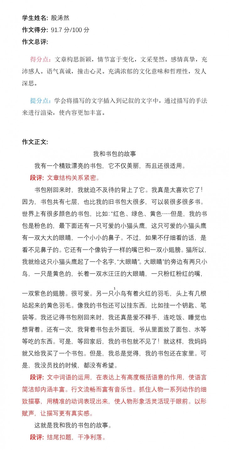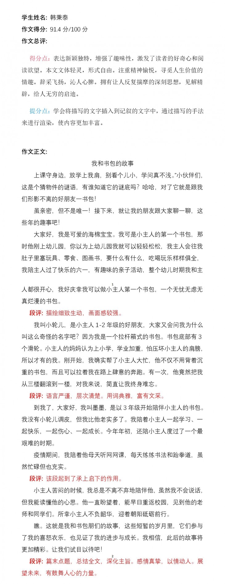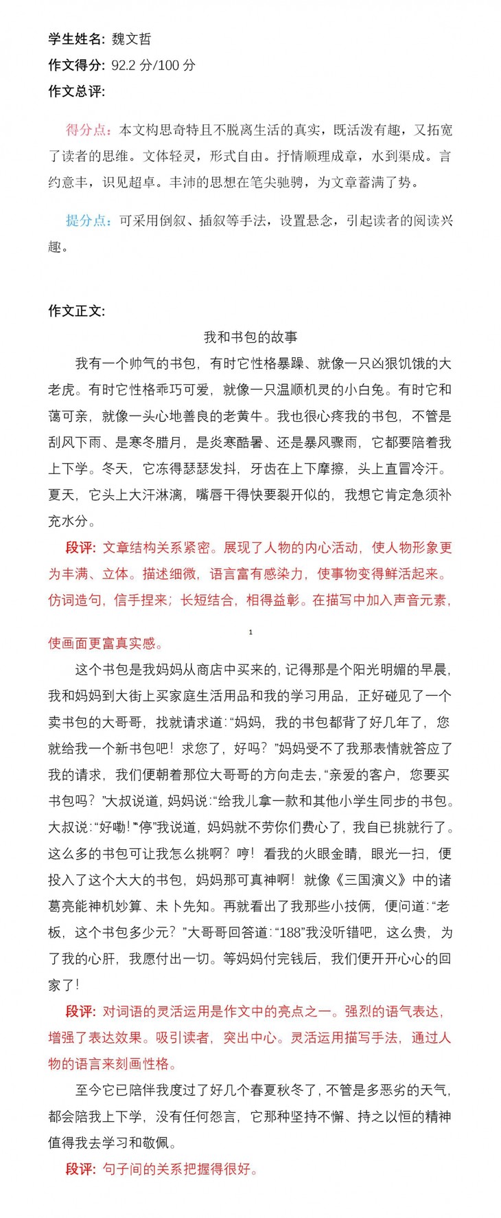 孩子在写作文时联系生活实际,以小见大,表达自己对书包的独有情感。希望孩子继续留心观察生活,拓展课外阅读,开阔眼界,积累知识,未来表现得更好。