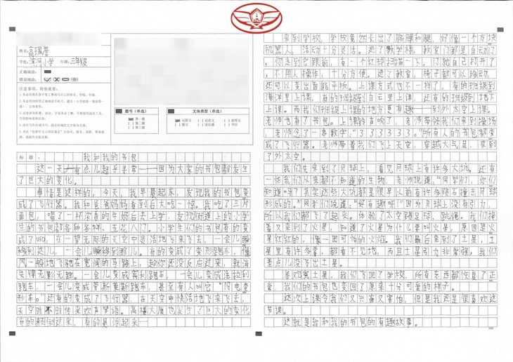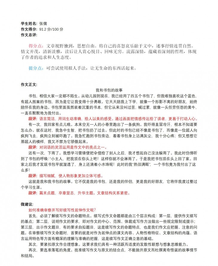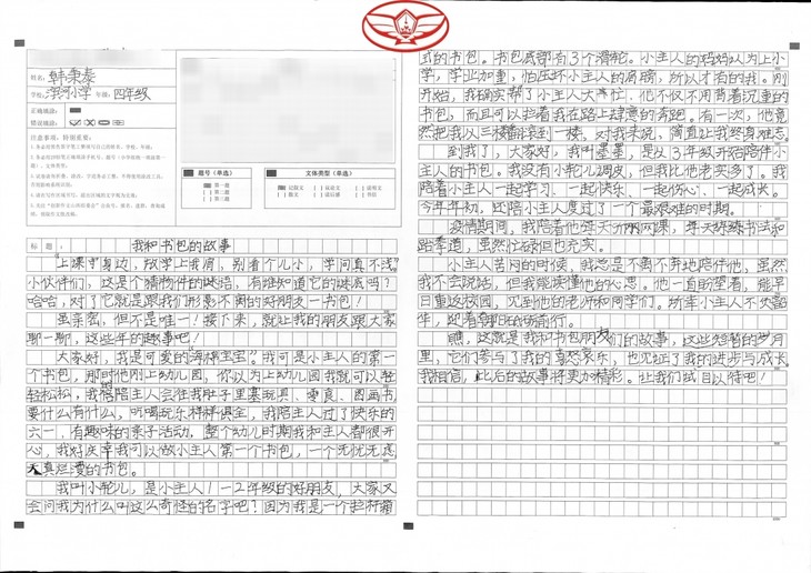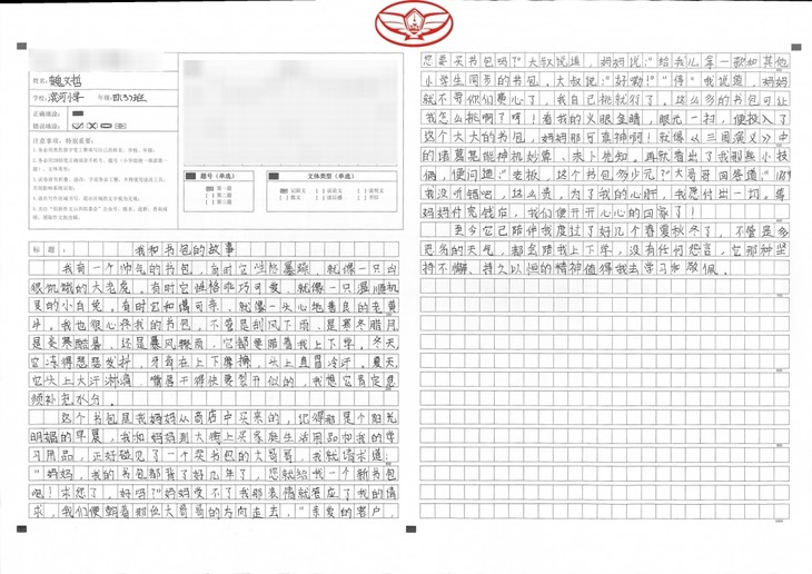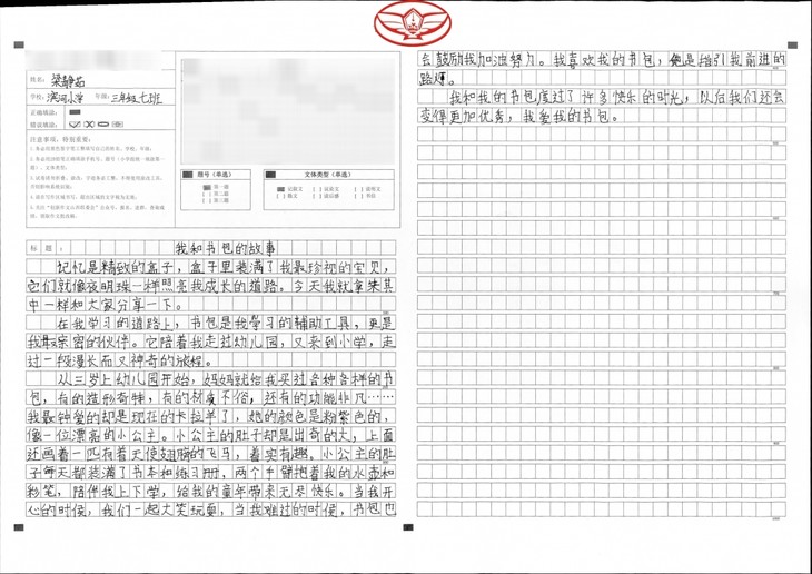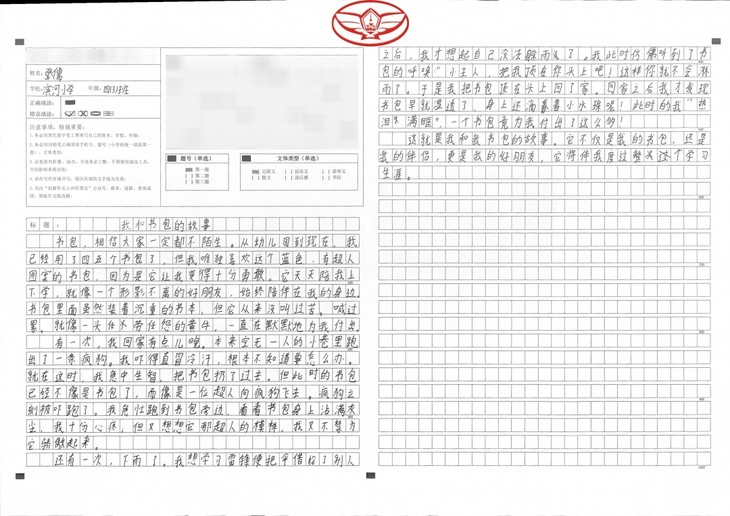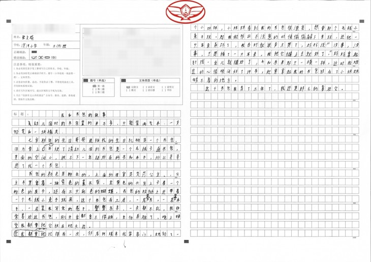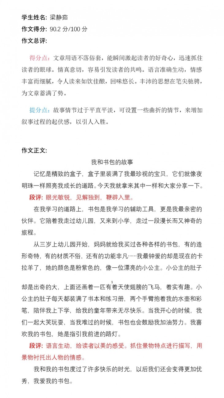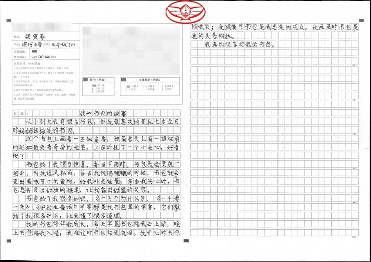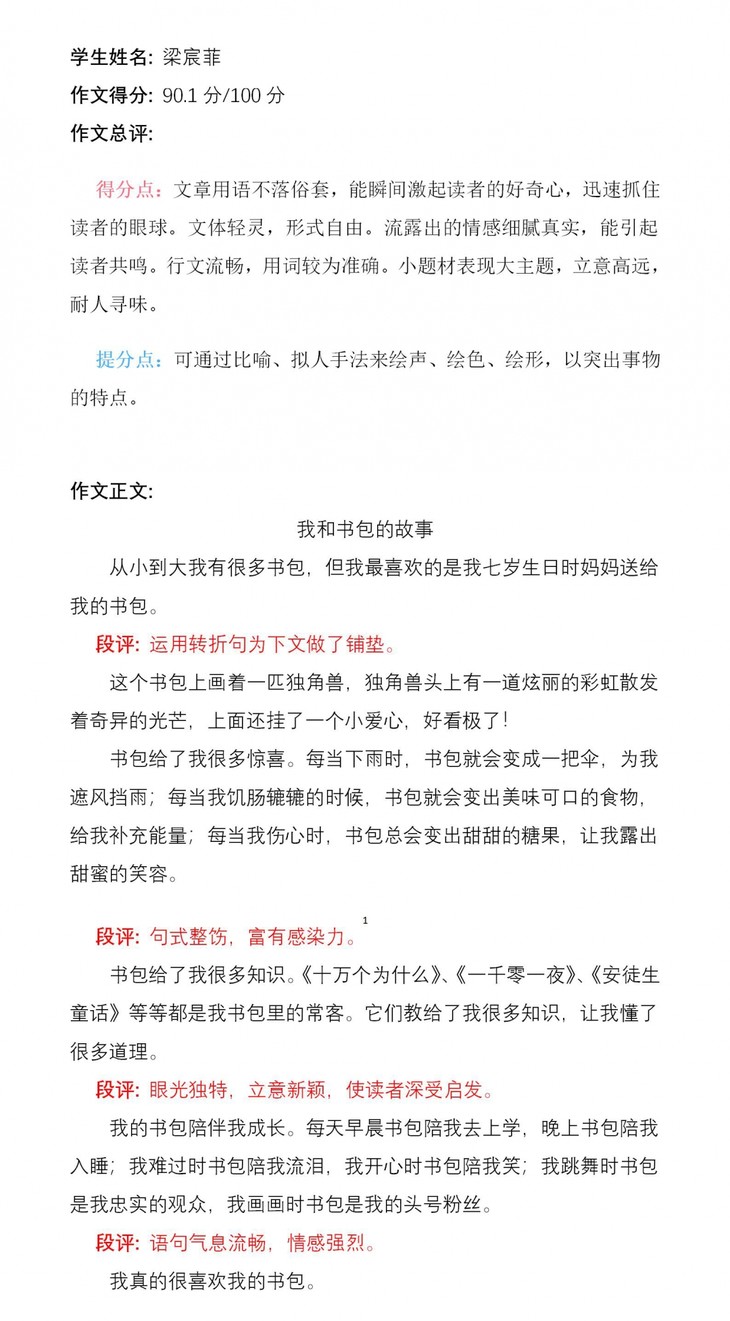 孩子在写作文时联系生活实际,以小见大,表达自己对书包的独有情感。希望孩子继续留心观察生活,拓展课外阅读,开阔眼界,积累知识,未来表现得更好。