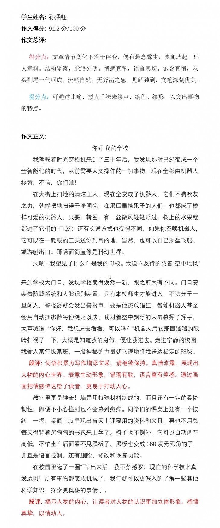 孩子在写这篇作文时,充分利用自己平时积累的课外阅读知识,将自己的想象与实际生活充分融合。这篇文章不仅反映了孩子的学习应用能力,同时也培养了孩子的学习兴趣,激发了孩子的写作积极性。孩子平时特别自律,学习习惯很好!希望以后可以更上一层楼!