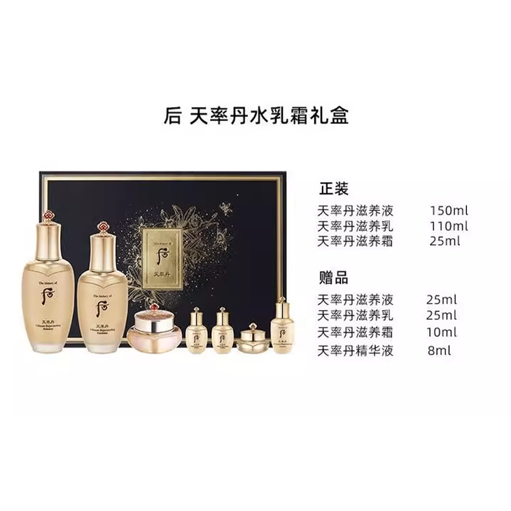 【Whoo后 天率丹系列】主打滋养修护功能,是专为熟龄肌设计的高端护肤系列。它的核心成分融合了东方草本精粹,能够帮助肌肤恢复弹性、紧致轮廓,同时改善暗沉和干燥问题,让肌肤焕发出健康光泽。