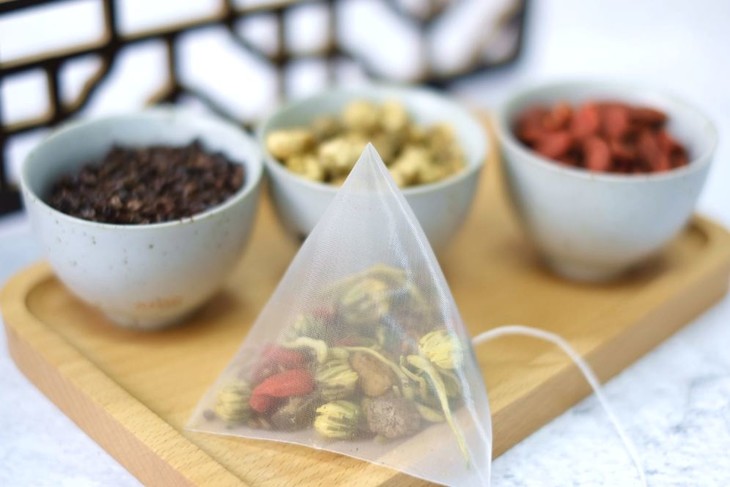 放入杯中,热水一倒,花香随着水汽散发出来。原料吸水膨胀,快速占据整个茶包。