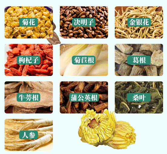 菊苣根清肝利胆,利尿消肿,修复肝损伤;牛蒡根散风热,消毒肿;蒲公英根清热解毒,消肿散结,利尿通淋;菊花散风清热,平肝明目,清热解毒;金银花清热解毒,疏散风热;桑叶疏散风热,清肺润燥,清肝明目。