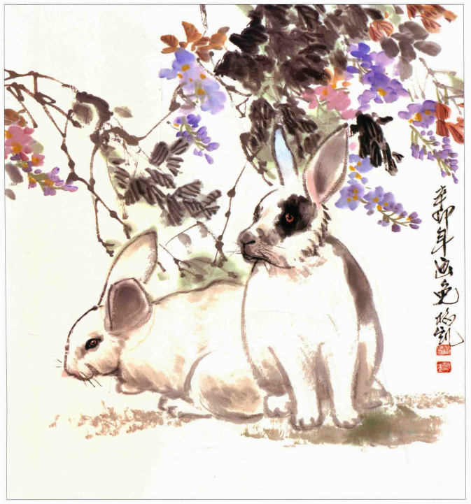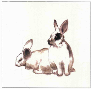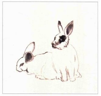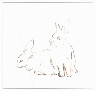 步骤一:用炭条勾勒出兔子的形态及双兔组合,起稿时注意兔子的动态 和前后关系。↓↓↓
