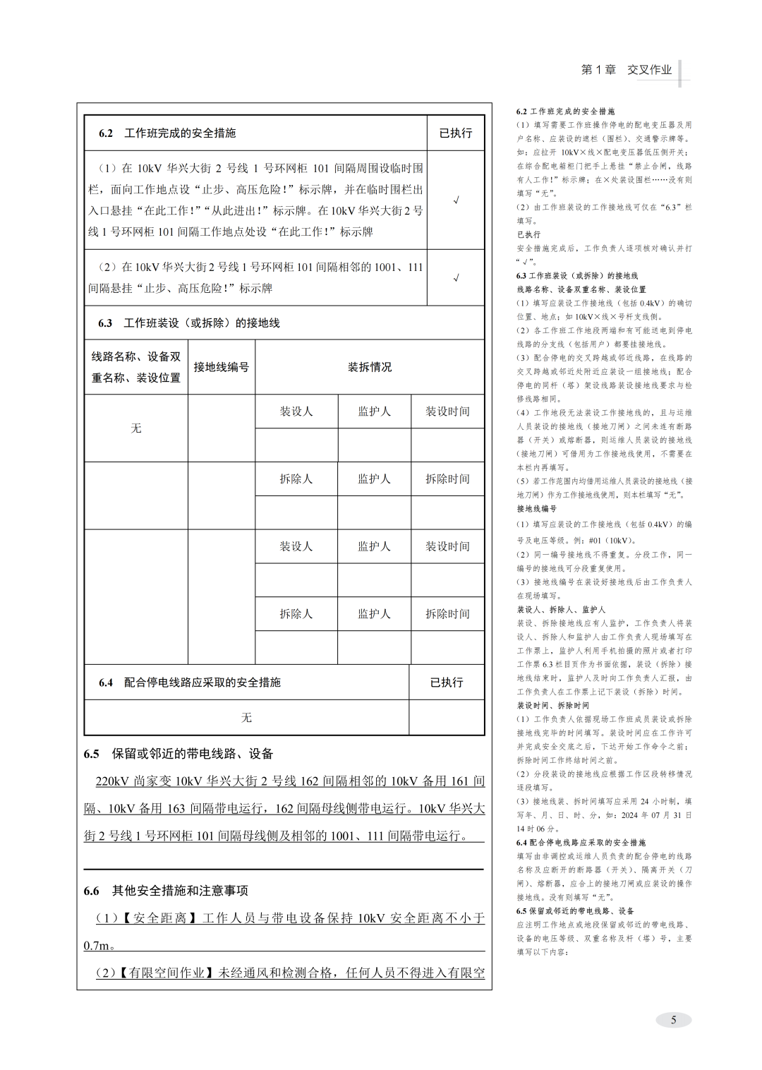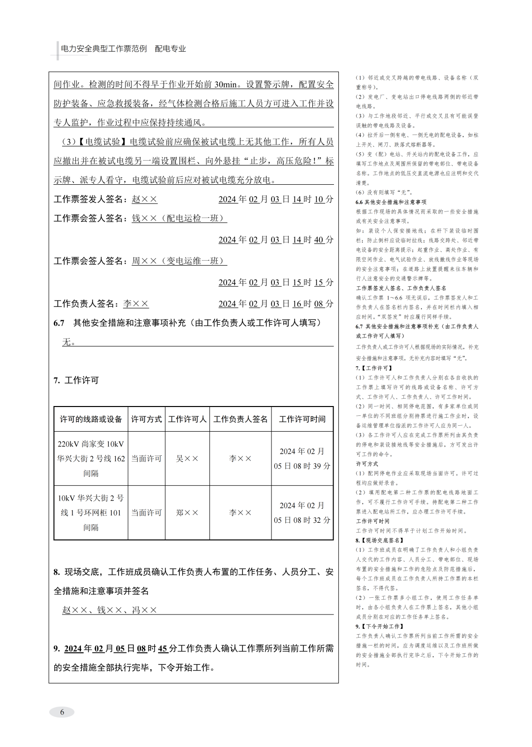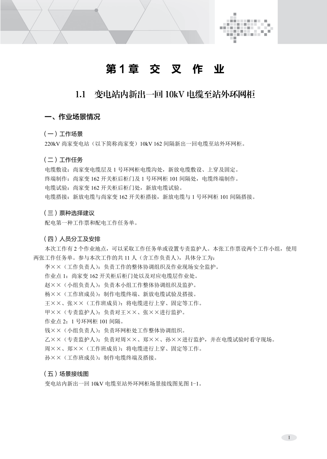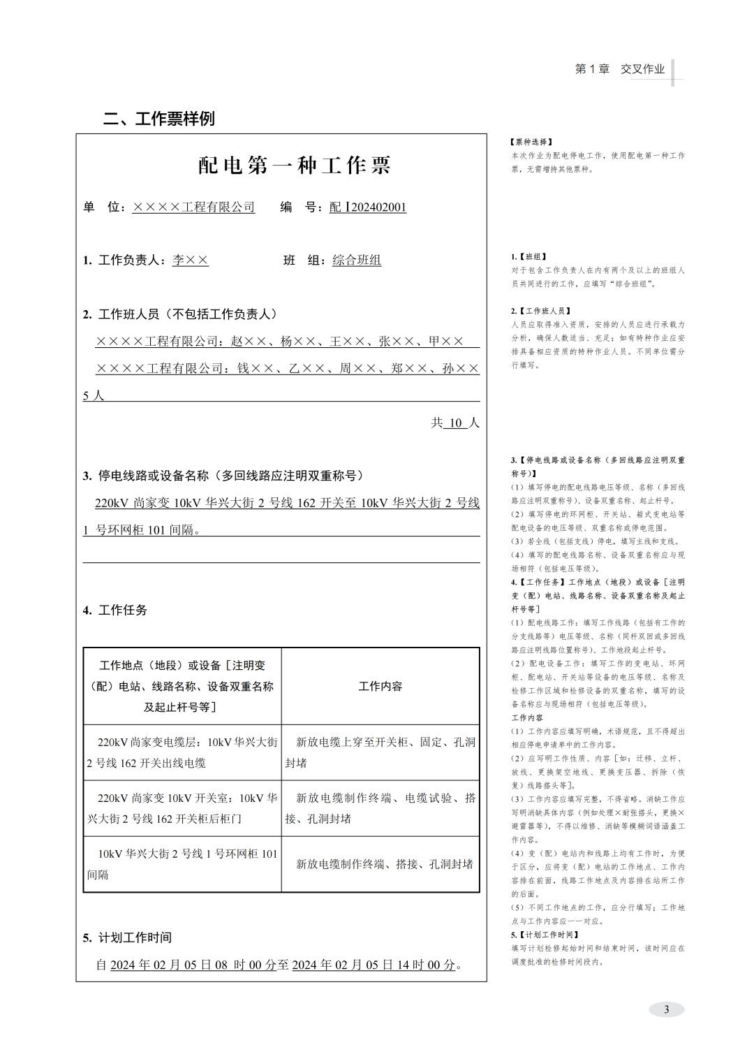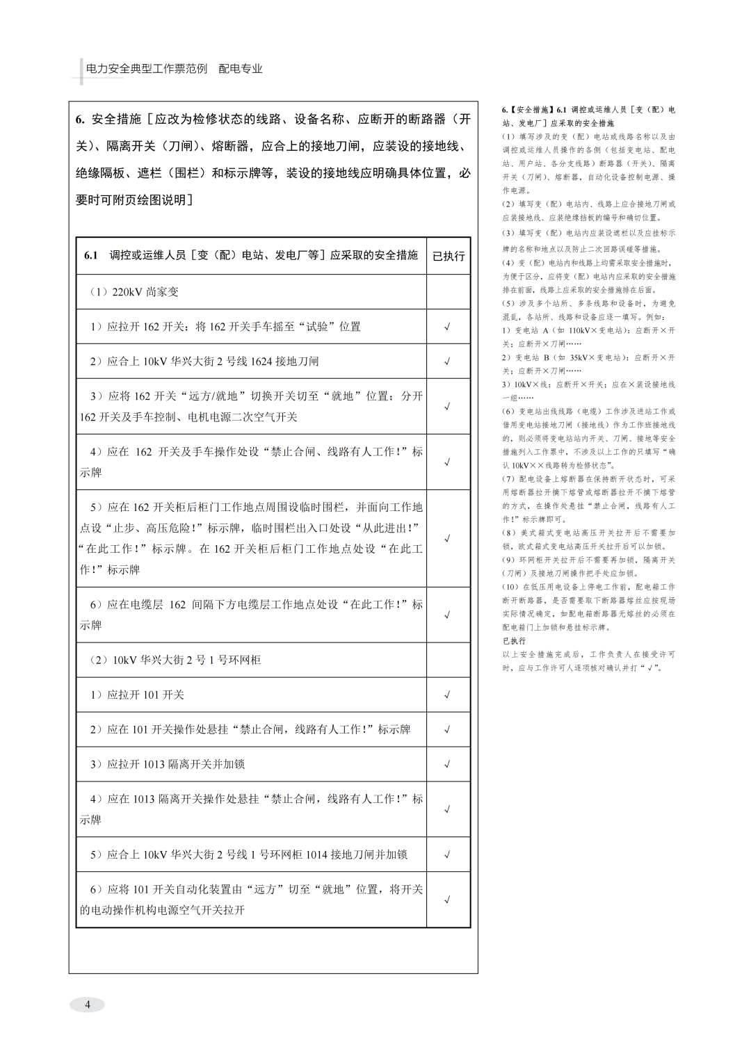 本册为配电专业典型工作票,编写严格遵循《国家电网公司电力安全工作规程》要求,包括交叉作业、电缆及线路作业、设备更换安装、迁改及其它工程等四个部分,共计27个具有广泛性和代表性的典型作业场景,其他相关工作可参考借鉴。典型工作票中所列的安全措施为“保证安全的技术措施”的基本要求,各单位在执行过程中可根据实际情况,在典型工作票的基础上对安全措施进行补充完善。