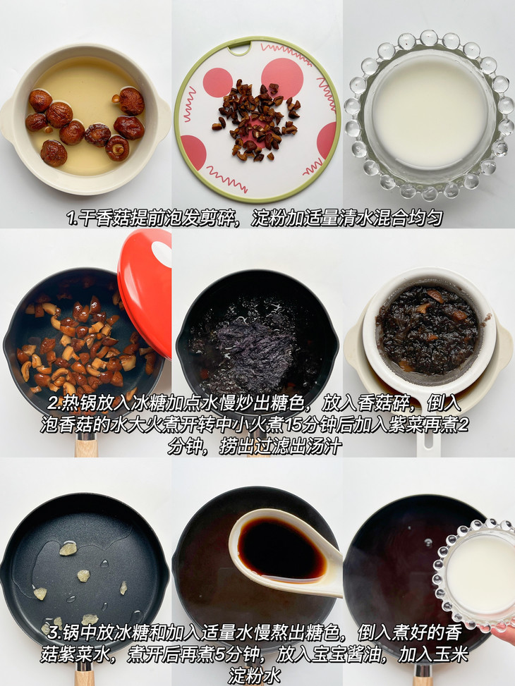 ❸锅中放冰糖和加入适量水慢熬出糖色,倒入煮好的香菇紫菜水,煮开后再煮5分钟,放入宝宝酱油,加入玉米淀粉水,不停的搅拌,煮至汤汁变浓稠即可