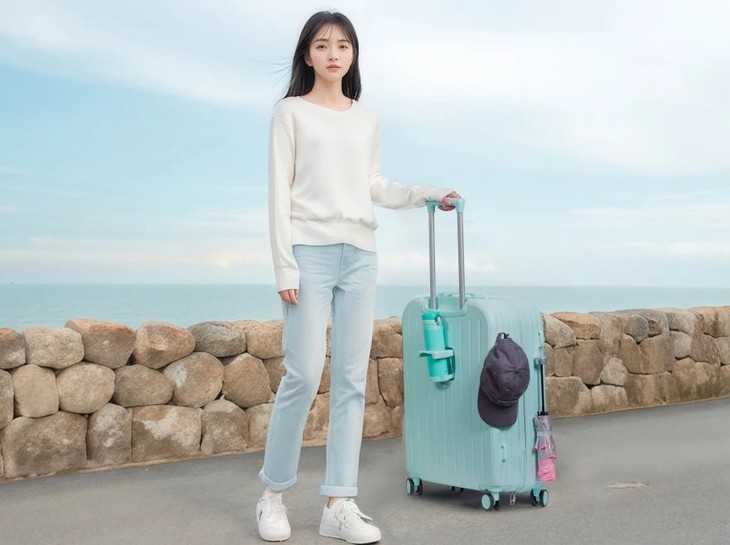 平常拖着行李拎着袋子,想喝口水都手忙脚乱。这个行李箱背面直接设计了个隐藏式“杯架”!放上保温杯、奶茶咖啡,太方便了。