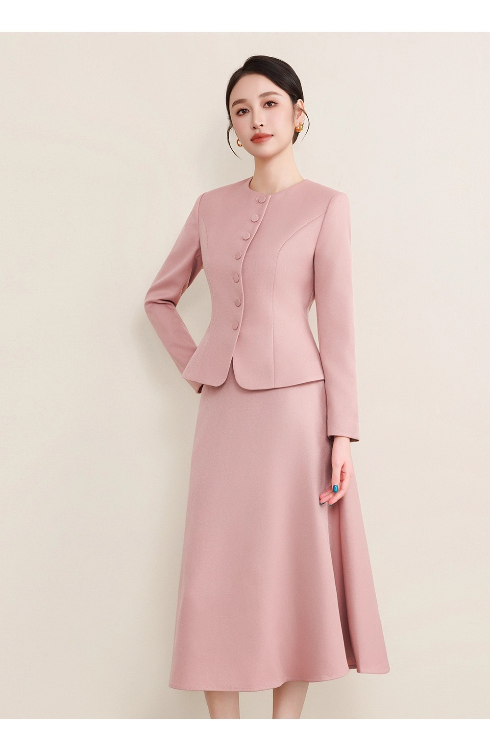 圆领设计简约大气,搭配单排纽扣,