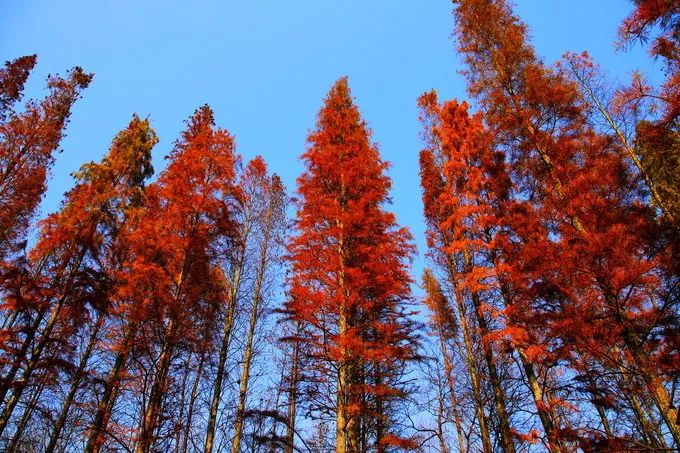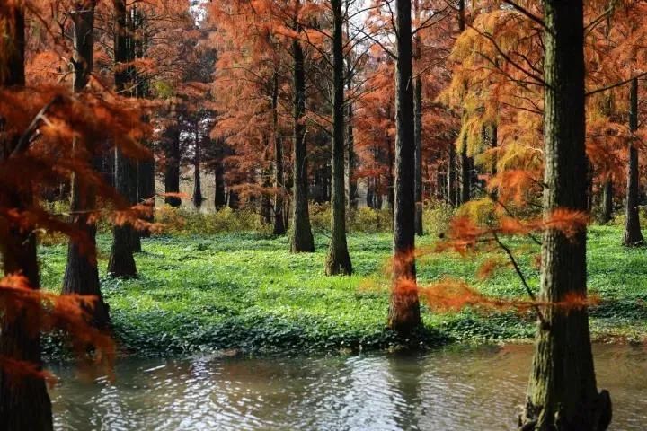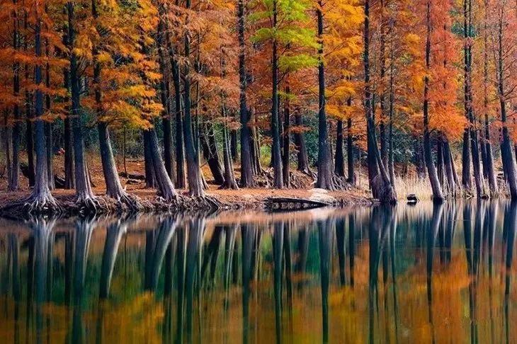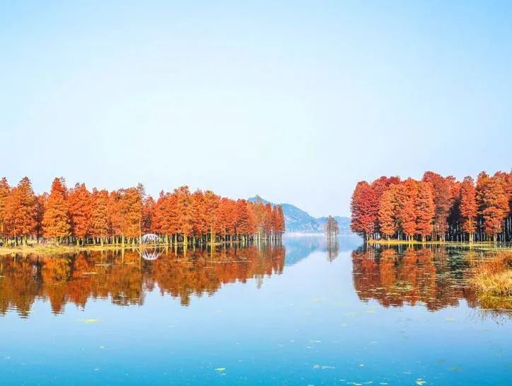 每到秋冬交替的季节,这里大片的水杉林便由绿变红,将湖面染成了火红色。