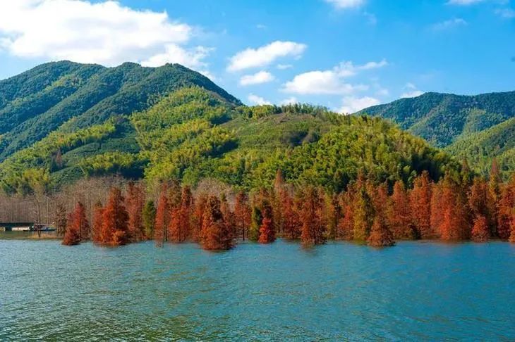 这里有宁波地区最美的水上红杉林,每到秋末冬初,湖里的水杉树叶由绿色变成橙红色,非常壮观,是秋季远近闻名的网红打卡胜地。