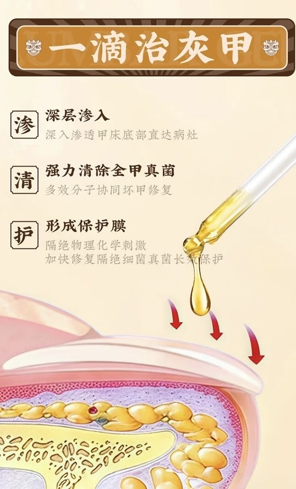 不伤肤、不拔甲,真正治疗灰指甲的王✅一深层渗透高分子精华渗透甲板直达病杜✅二清除坏甲多效分子协同修复灰甲细菌真菌✅三保护好甲在甲床形成保护层防止二次感染