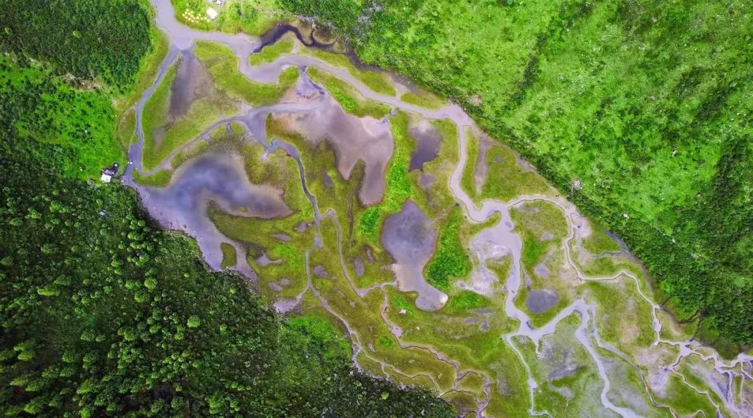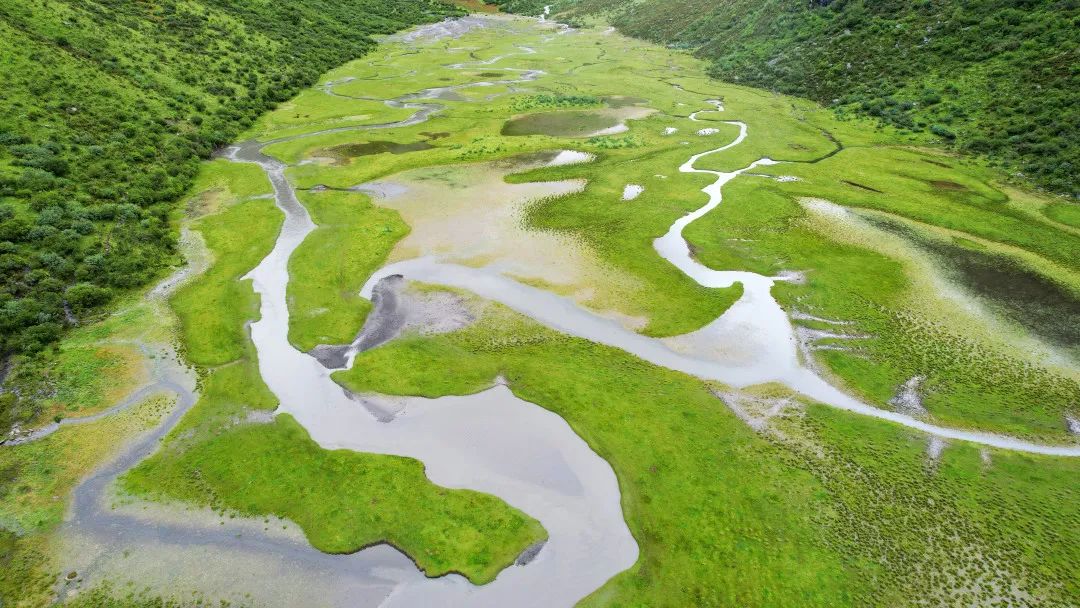 溪流交错的花海子像一张绿色地图横亘于山谷之中