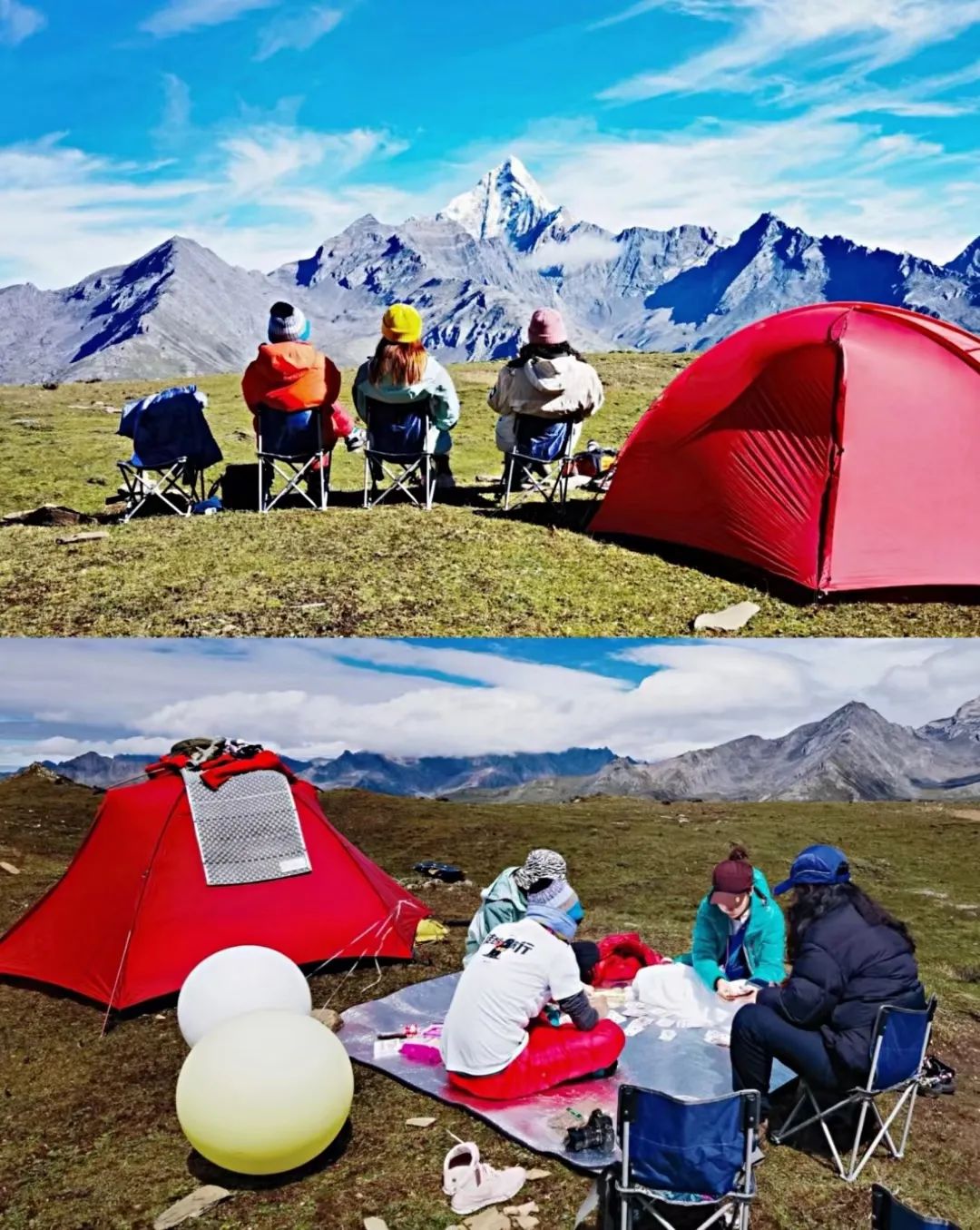 铺上防潮垫、摆上瓜子零食、安排上棋牌娱乐活动,时间流淌进广袤的天地间,恍若不觉。海子旁露营,雪山下打牌,轻奢享受,大抵就是如此吧。