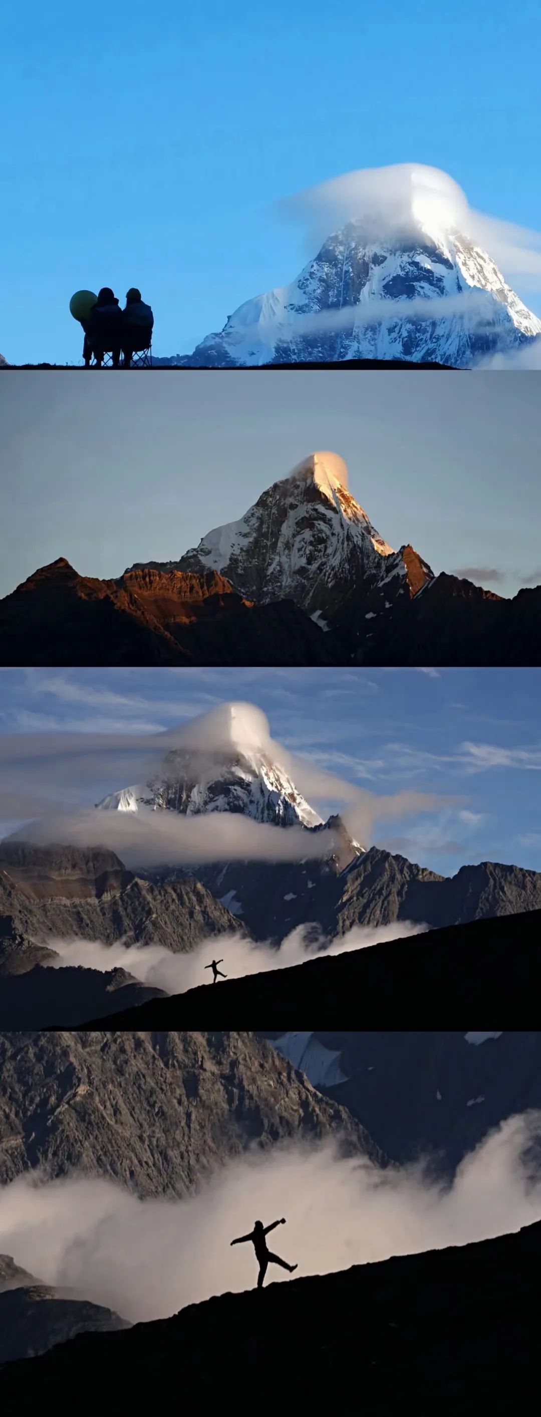 清晨 6 点多被帐篷外的惊呼唤醒,拉开帐篷帘一抬眼就看到了四姑娘山主峰「幺妹峰」静静矗立在晨光熹微中,空气因稀薄而清透,光线自东边照射而来,然后不断升高,短暂的时间内光影变幻,近距离上演了一场日照金山的壮丽。