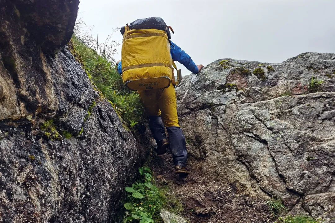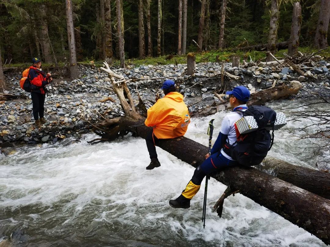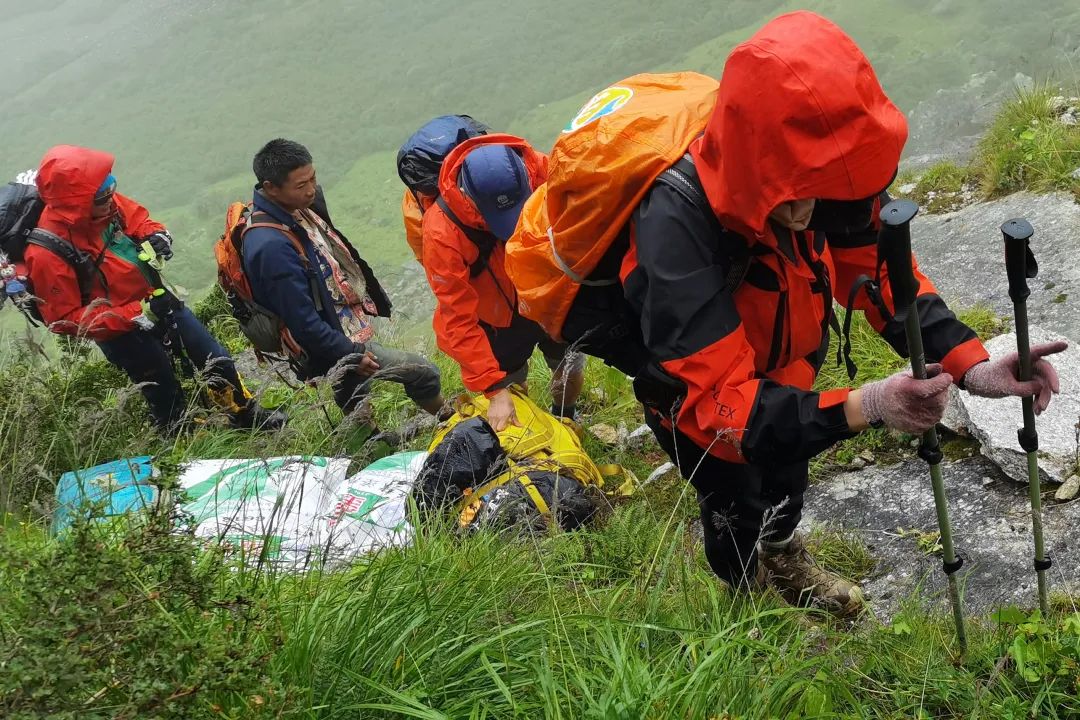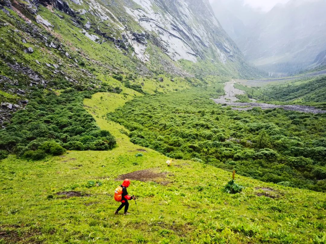 生命一旦受到威胁,总是更容易感知到活着的意义。探路的过程中,有一段近乎垂直 90° 的岩壁难以自主攀爬,脚下是险坡,头顶是岩壁,还没从第一次见识这种场面的惶恐情绪中出来,向导和领队已经把吊绳拴在了我腰上,没有时间害怕,就立刻手脚并用地往上爬,然后一个接一个,最后全员才在安全地带劫后余生般一屁股坐在草地上平复呼吸。
