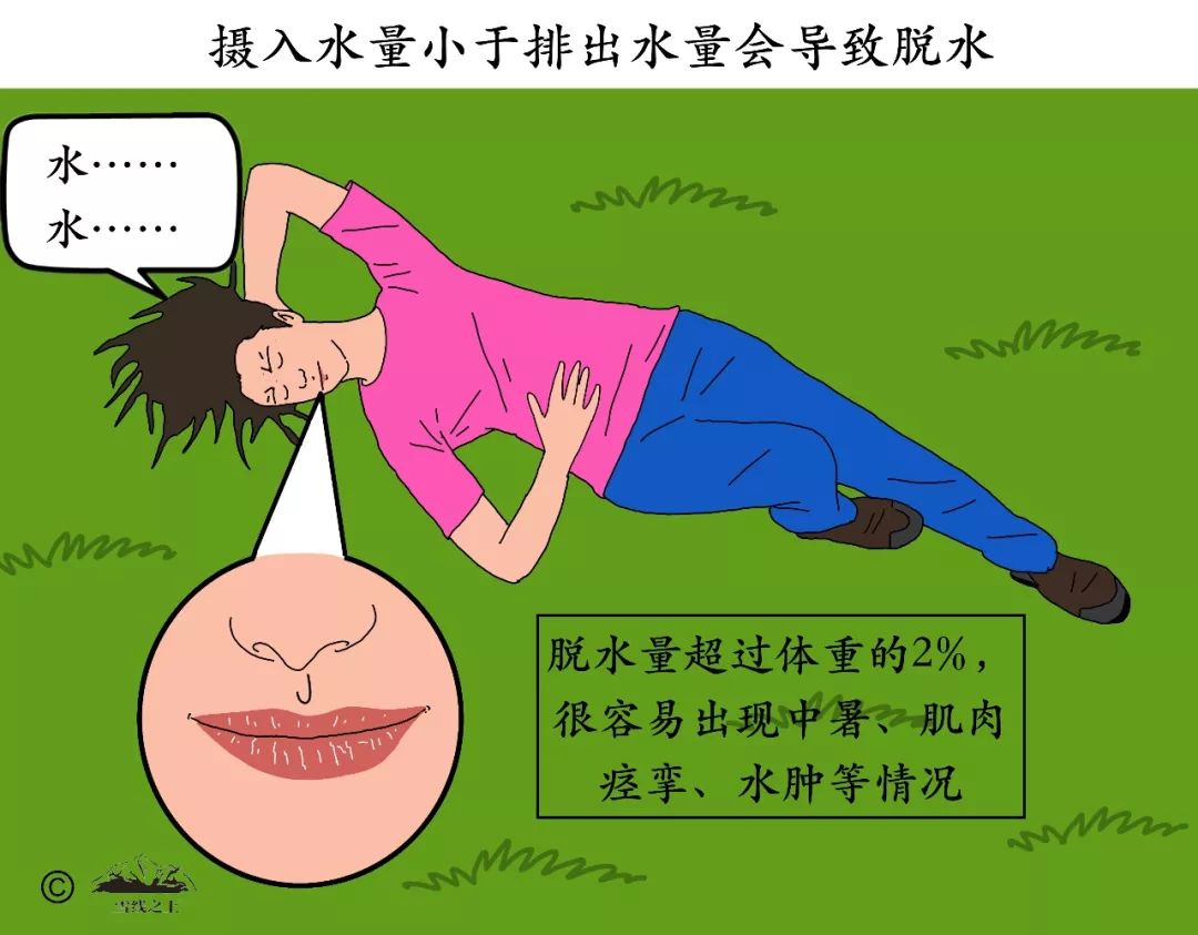 如果摄入的水量不足,平衡状态被打破,身体就开始脱水。一个体重50公斤的山友仅仅缺水1升,肌肉能力就会减弱。