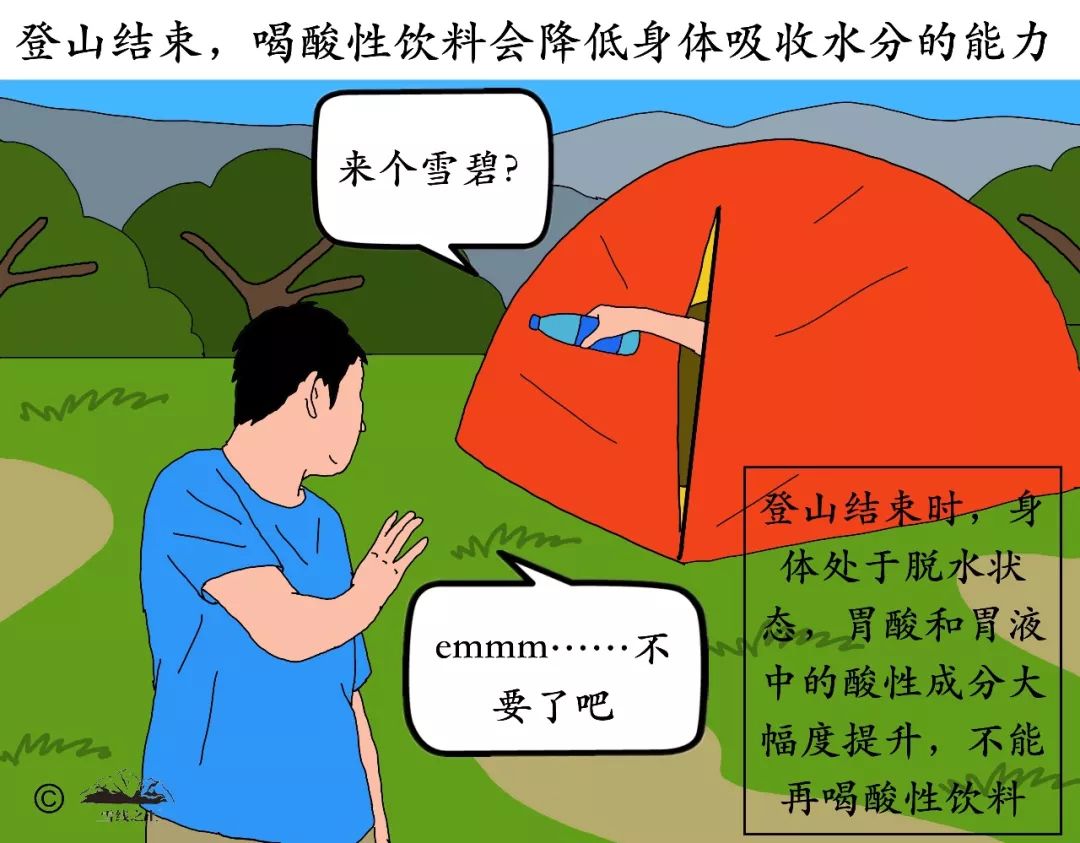 登山结束时,身体处于脱水状态,胃酸和胃液中的酸性成分大幅度提升,此时补水应当远离酸性饮料,以免阻断胃排空,影响身体吸收水分。