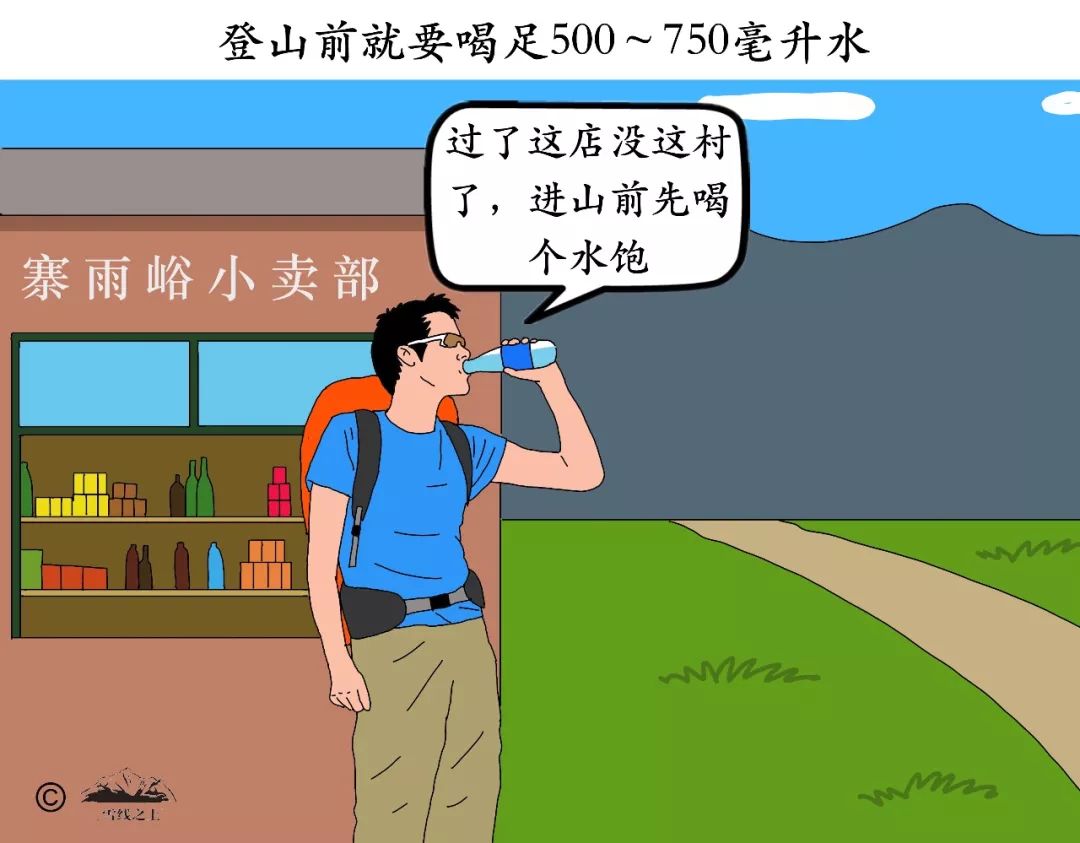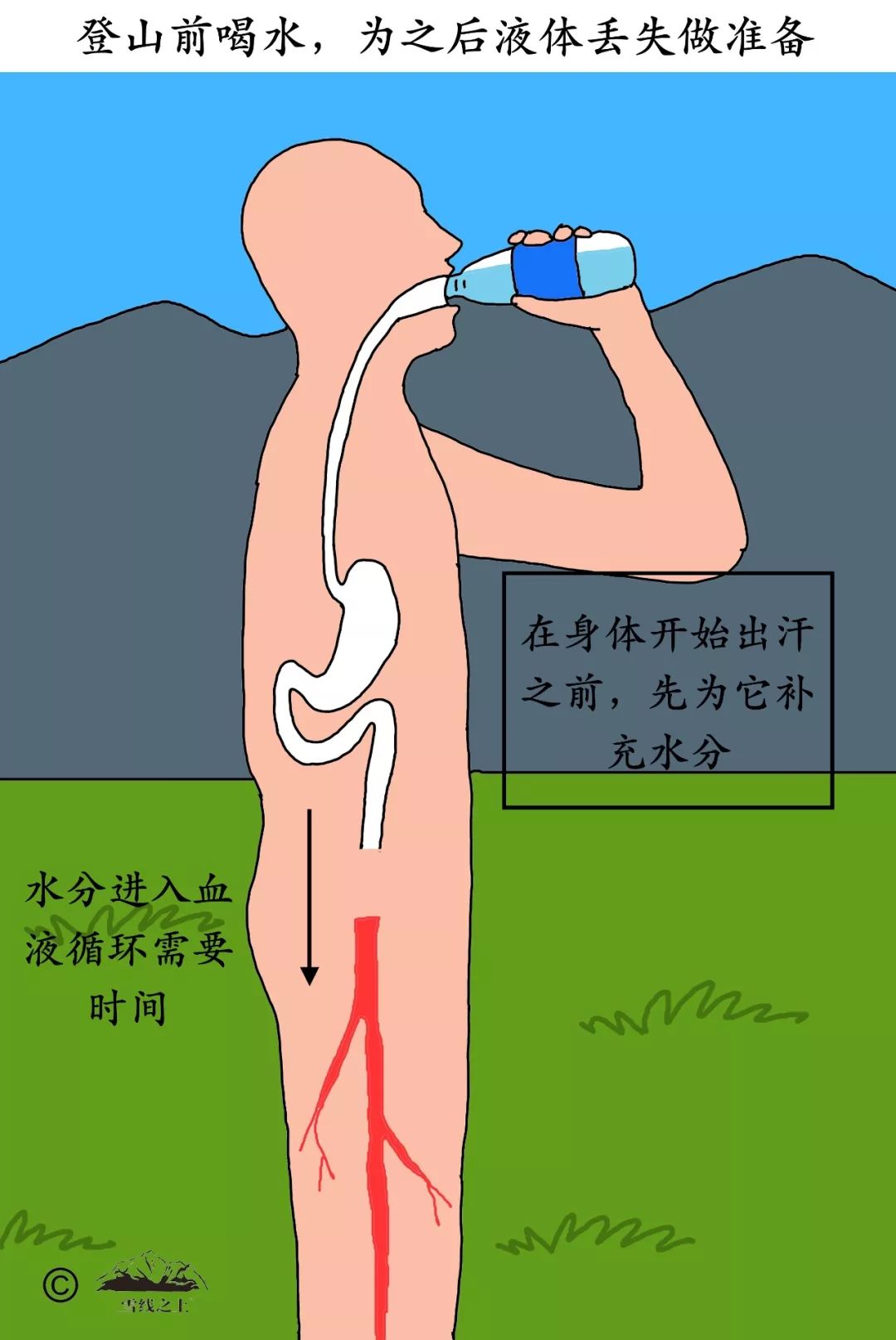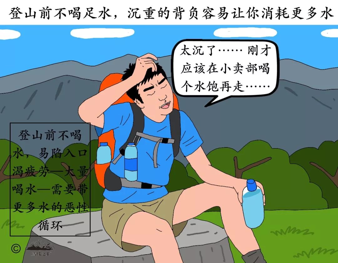 不趁登山前水源充足时预补水,开始登山时,还没有适应登山动作的身体很容易感到口渴疲劳,这时往往会使劲喝水,由此就需要携带大量的水登山,水的重量会加重疲劳,于是又需要补充更大量的水。
