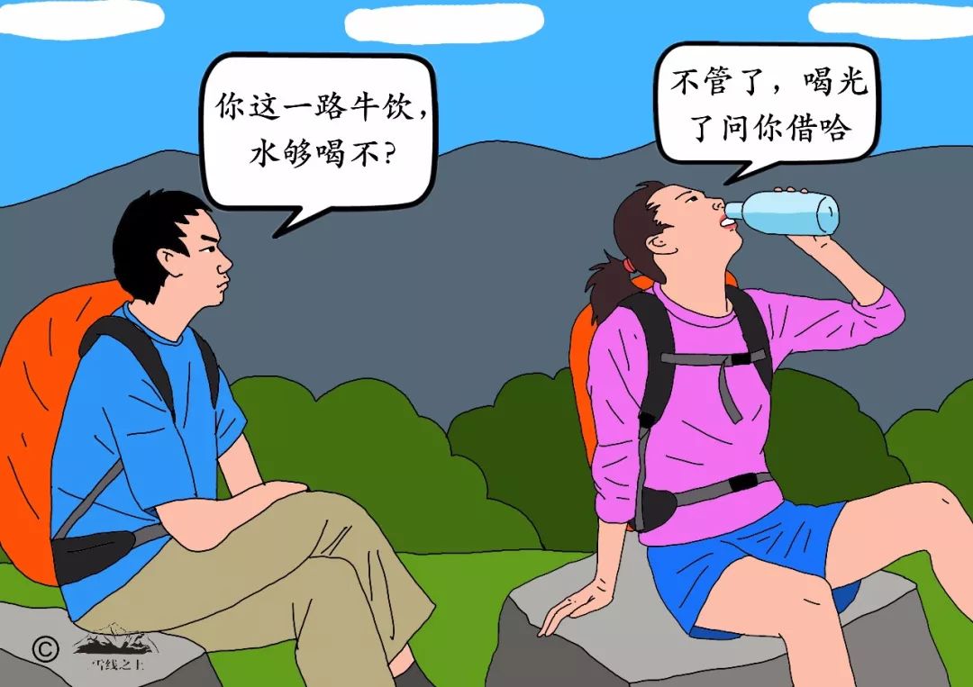 如果带水太少,到了山上大量排汗,接连猛喝,水很快被耗光,不得不向其他山友借水,或者忍着导致脱水、中暑。