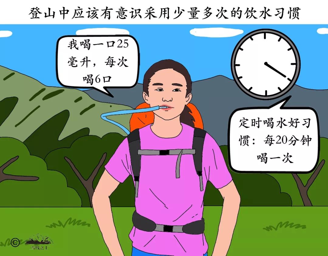 少量:登山时喝水切忌大口“牛饮”,否则会给胃造成不适,还会增加登山中排尿的次数。