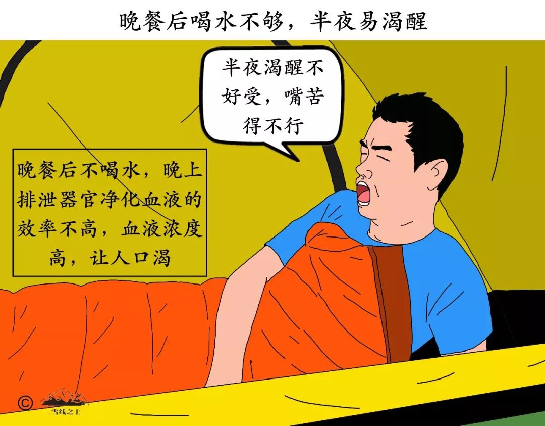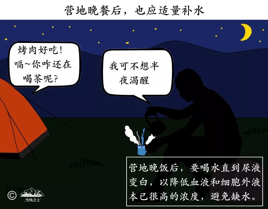 登山结束后的补水是出于填补亏空的需要,而营地晚饭后补水亦不可忽视。