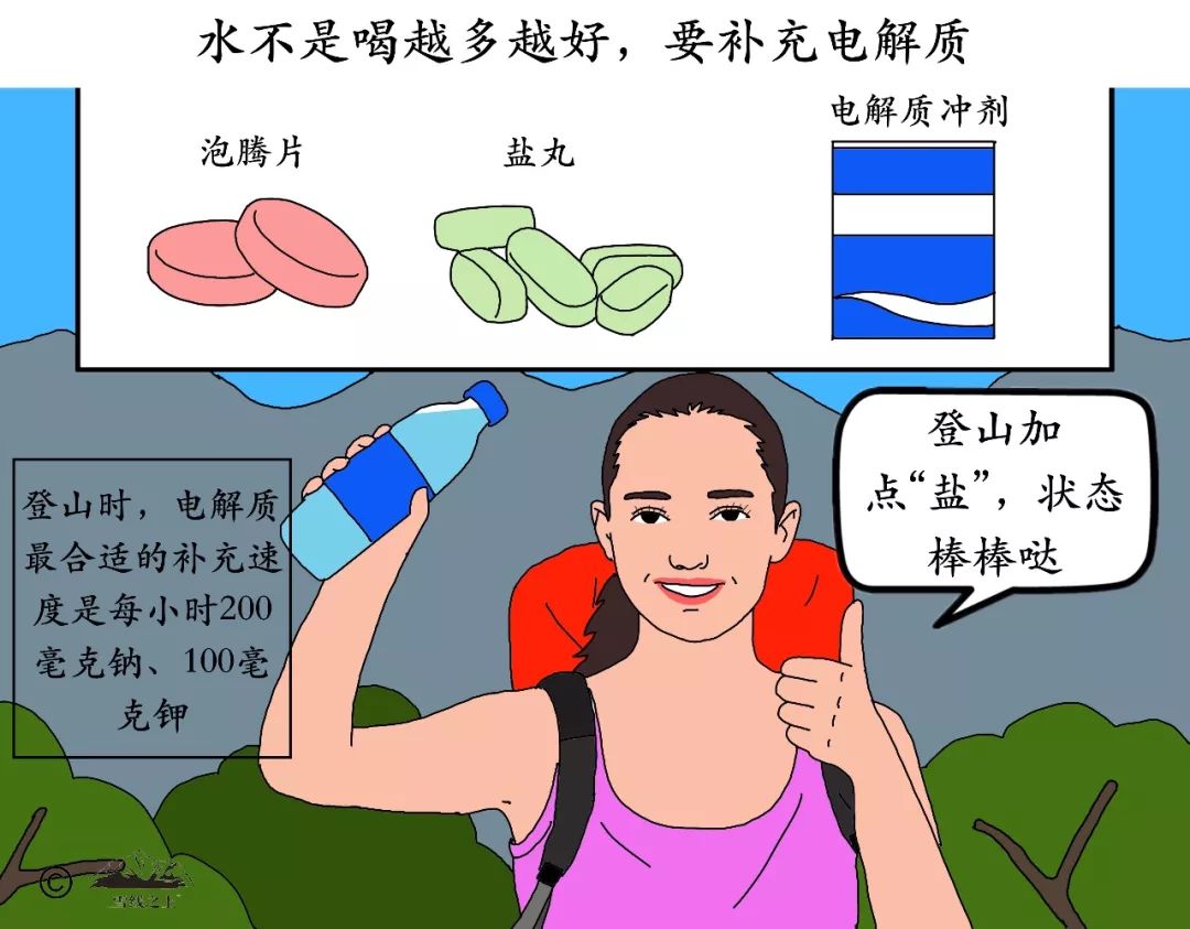 在该喝多少水的问题上也要明白:饮水也不是越多越好。登山时大量出汗,含有钠、钾、少量的钙和其他电解质成分随之被排出,如果大量饮用纯净水也会导致体内电解质被稀释,引发低钠血症和肌肉痉挛。所以,登山时喝水,你也需保证电解质的补充。