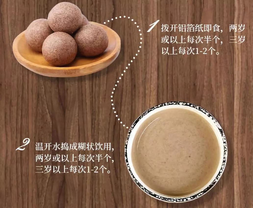我们的八珍糕丸食用方法有两种,第一种方法比较简单,直接剥开铝箔纸食用即可,第二种可以用温开水化开,捣成糊状使用,大家可自由选择哦。