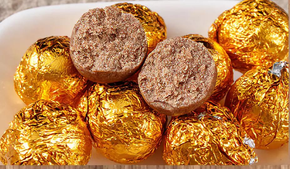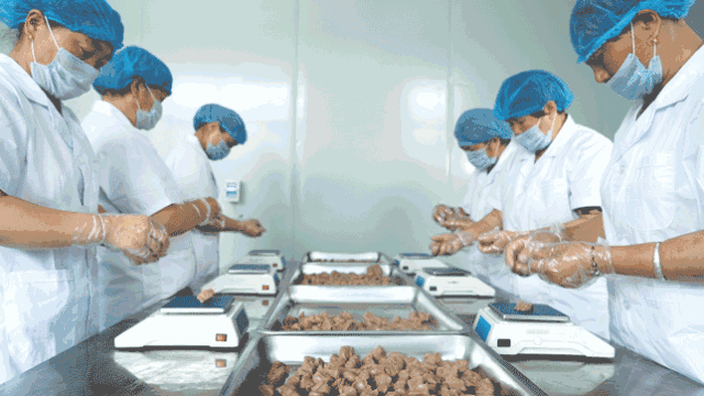 配料好的蜜丸,不能由机器成丸,机器无法制出这种软糯的口感,而必须由穿着卫生服的工人经过严格比例称重,由人工搓至成丸,再包装而成。