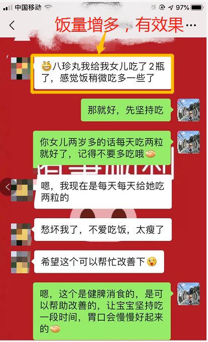 自从小编告诉她八珍糕丸可以调理脾胃后,坚持给孩子食用了一段时间,现在孩子脾胃好了,吃得也香了,朋友脸上的笑容也多了,小编这心里也没有那么担心了。
