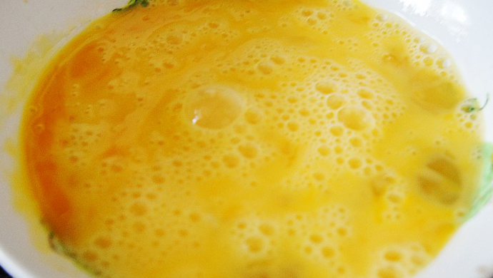2、把鸡蛋打入碗里抽打均匀,放入3指1捏盐后继续抽打均匀;