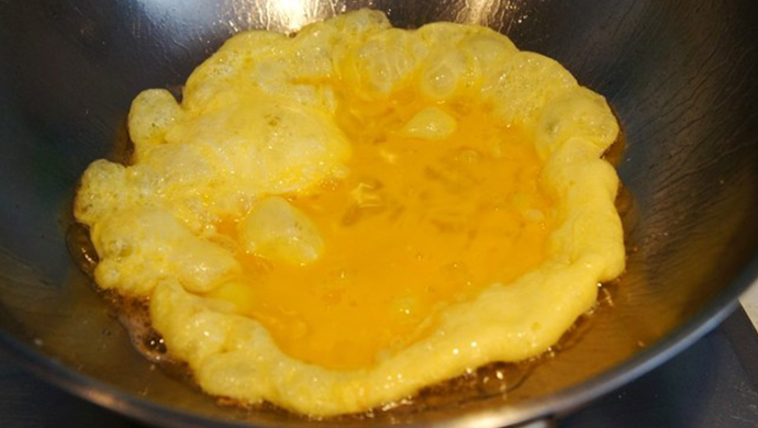 1、锅烧热,放入1勺豆油(炒菜勺),待油起烟后关火,晃一下勺(锅壁沾上油),然后顺着锅边倒入鸡蛋,把火打开翻炒几下变成大块盛出;