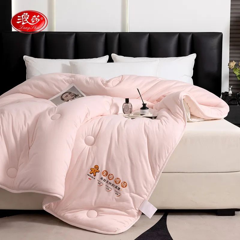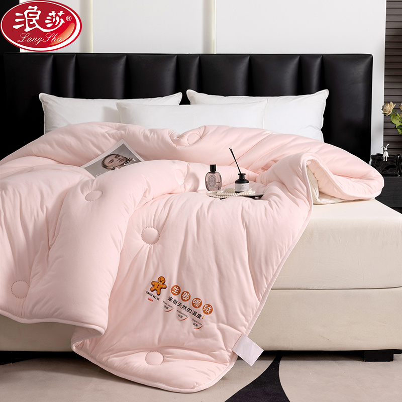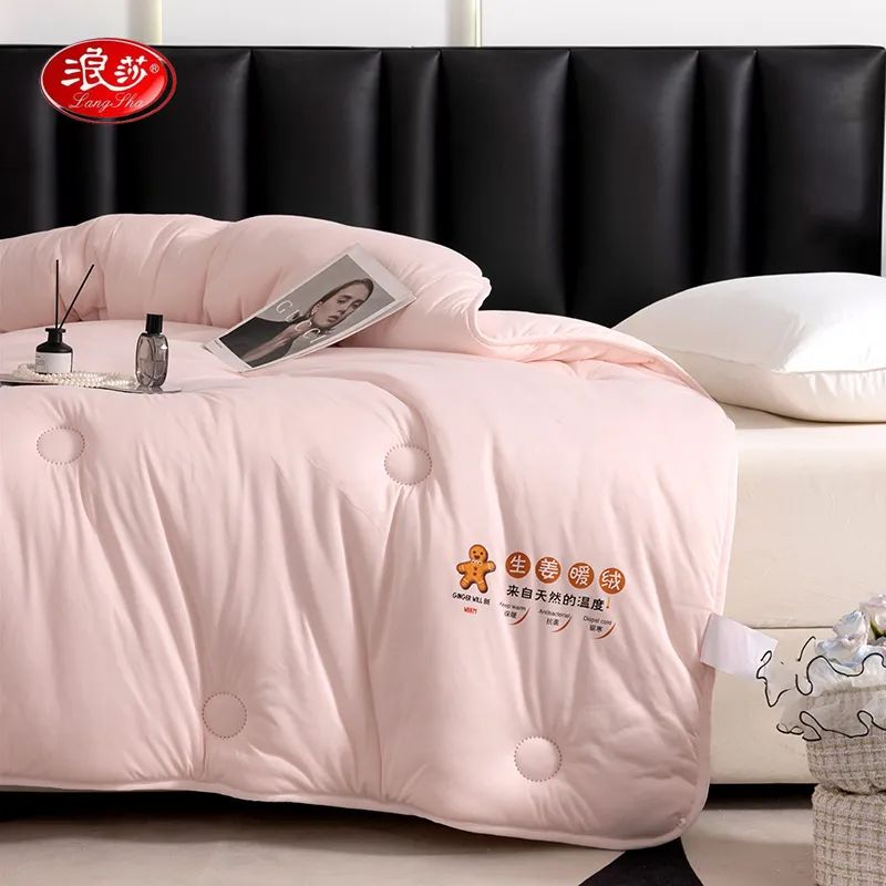 浪莎生姜暖绒被的暖姜纤维是利用植物萃取技术提取生姜中的有效成分,再经纺丝工艺加工,制成具有保暖功能的一种面料。