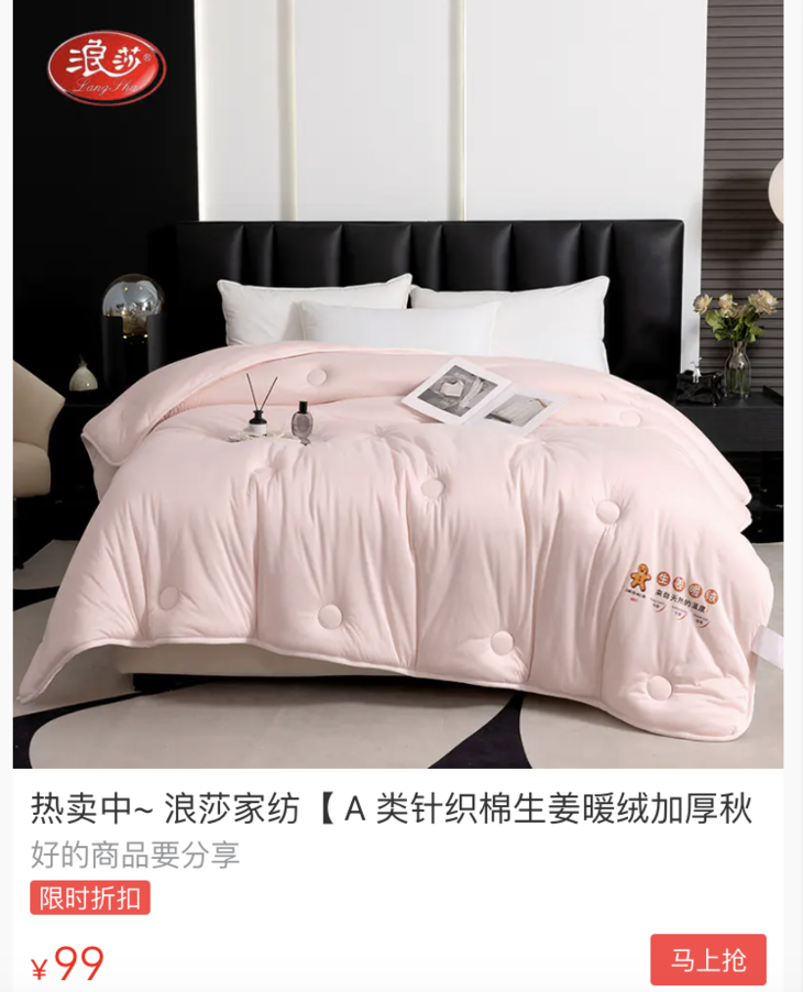 但!!这次是浪莎生姜暖绒被shou次在自媒体推广,所以申请到了每个规格100张的优惠价,原价的零头就能拿下: