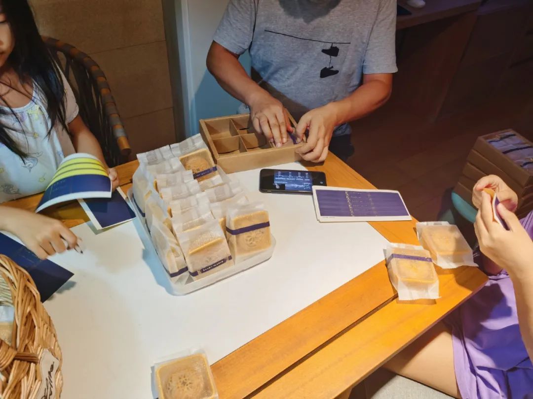 天姐儿放学后,晚上也帮忙贴月饼签,忽然让我想起小时候与爸妈哥哥们晚上一起包饺子的情景,一家人围坐在一起做点这样的手作,对于现代的家庭来讲,好像也是一种奢侈了。
