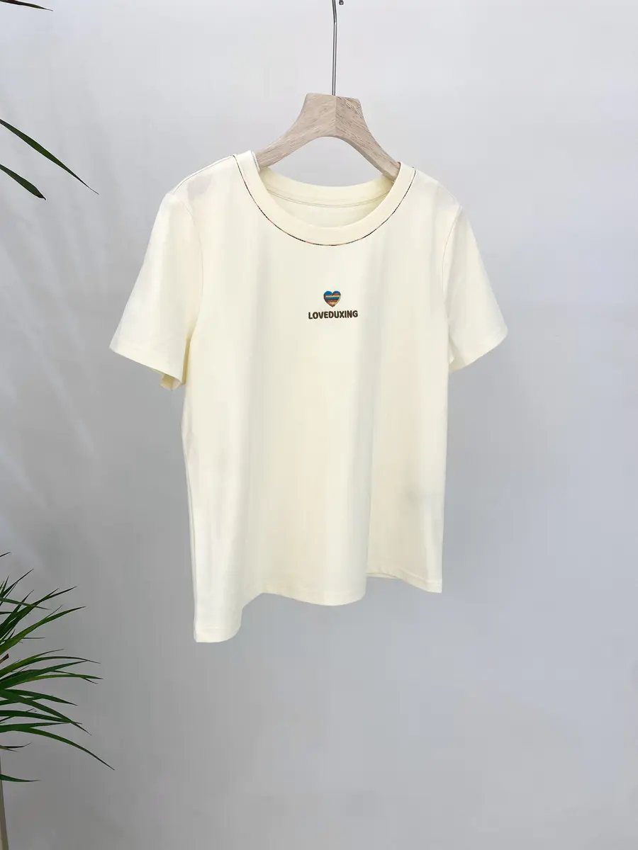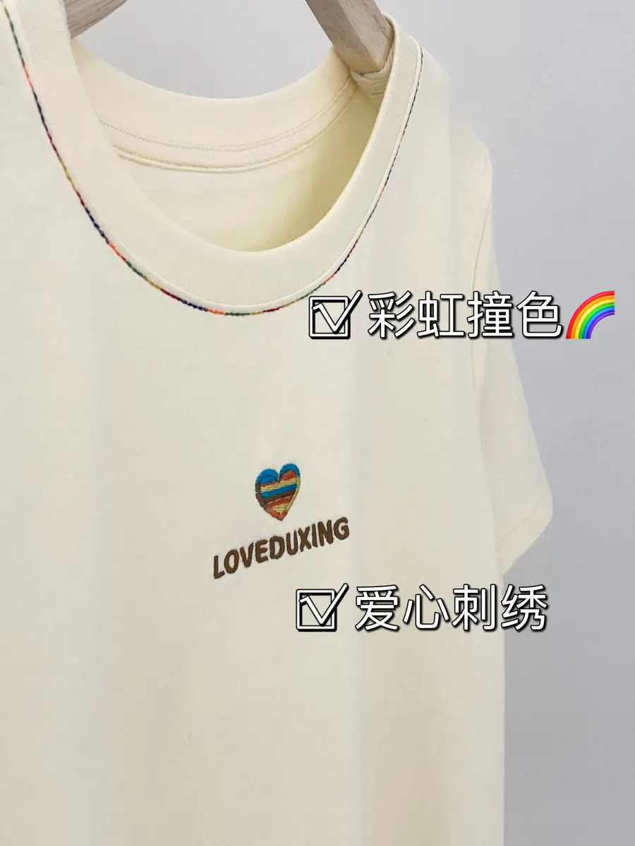 一眼爱上的T恤,浅黄的颜色,奶呼呼的超级显嫩,主要的亮点在于胸口和领口的彩虹色刺绣点缀,非常精致可爱~