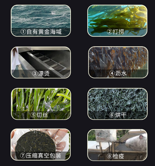 采摘新鲜幼嫩小海带,脆嫩爽口,新鲜打捞上岸的小海带要经过清洗-漂烫-沥水-切丝-蒸汽烘干-压片-压缩真空包装-检疫等多道步骤,才能得到干净无沙的压缩海带丝。