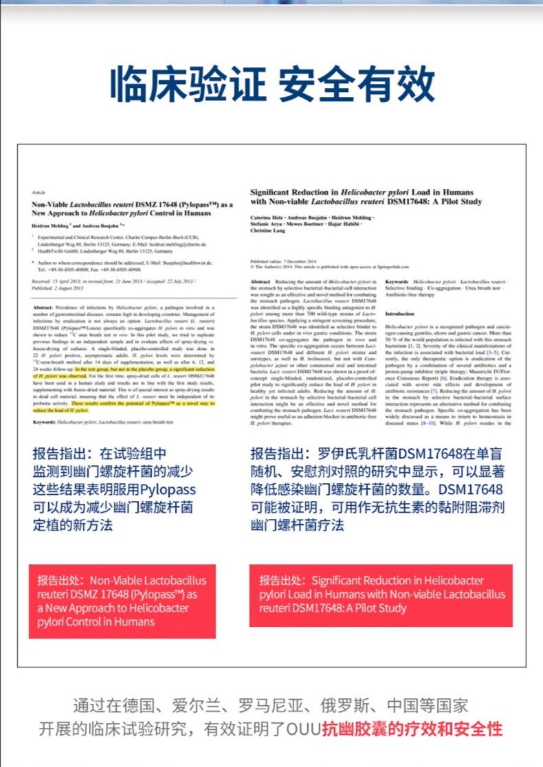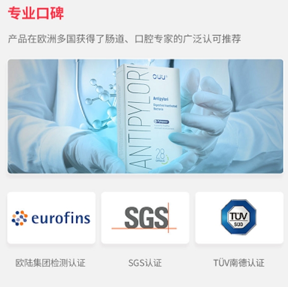 更重要的是因为OUU抗幽胶囊是以天然、物理的方式减少了体内幽门螺杆菌数量,从而改善胃部健康状况,没有副作用也不会产生耐药性和依赖性。而且由于是灭活菌,因此服用后不会干扰肠道内正常微生物的平衡,不必担心肠胃道菌群失调的问题。