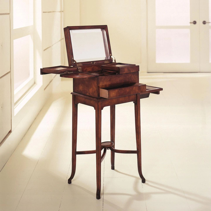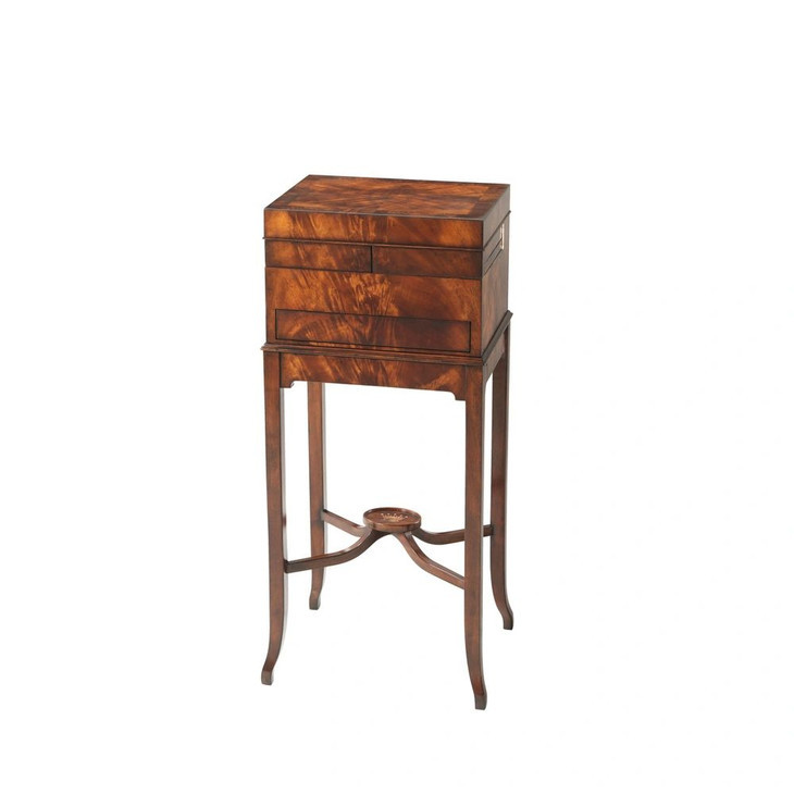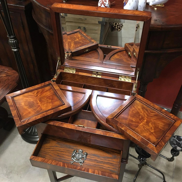 这是一款来自英国斯宾塞贵族复刻古典梳妆箱,材质由桃花心木打造,揭开顶层的面板,露出一面斜边的镜子以及内部的储物格,下面带有一个抽屉,侧边带有一张可拉出式工作台,方便梳妆时的操作。箱子腿部加入‘ X ’造型并且装饰有斯宾塞家族的皇冠图案。