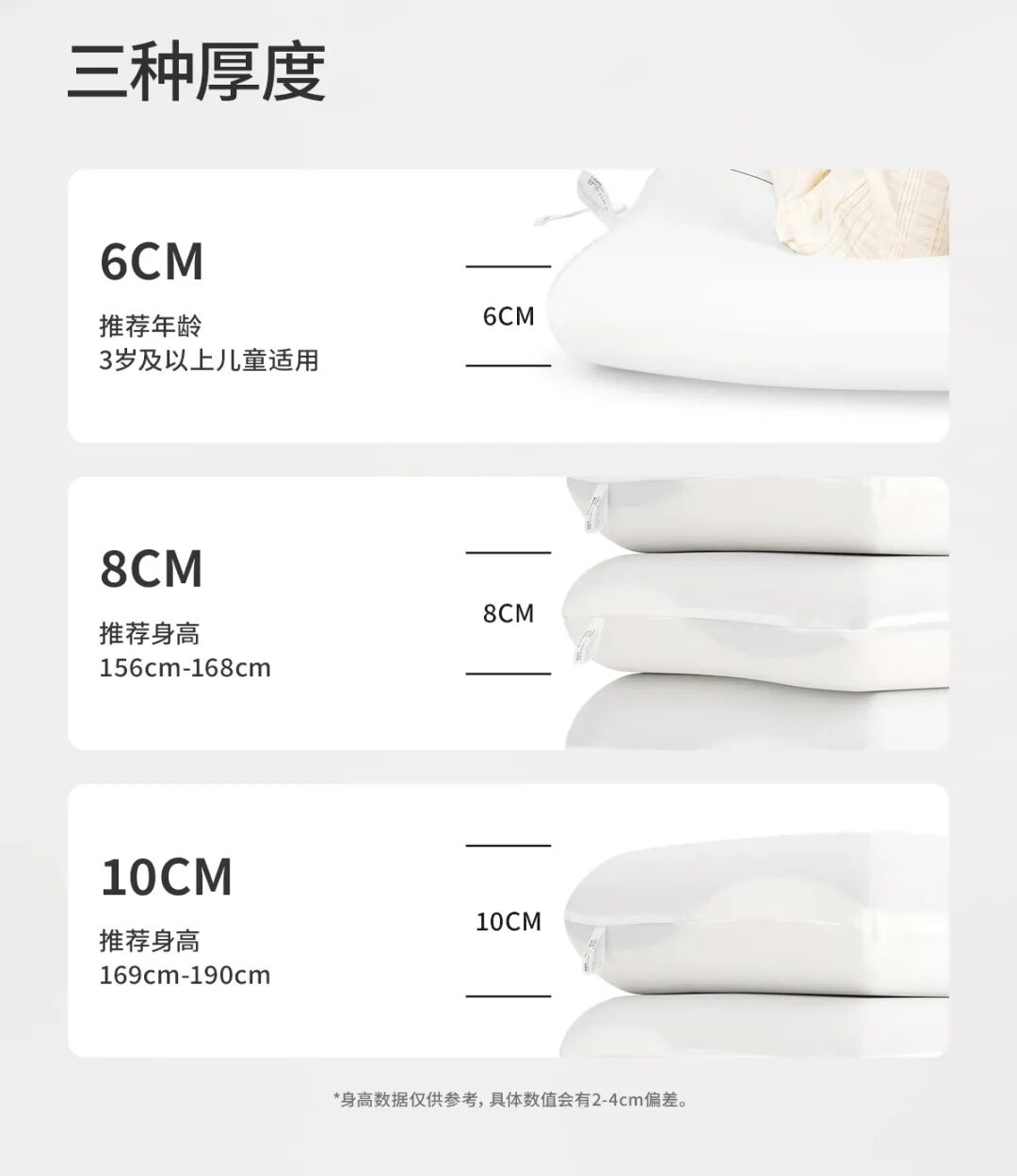 而这款枕头,它还特别贴心的区分出了尺寸和高度,这样全家都能买到合适的: