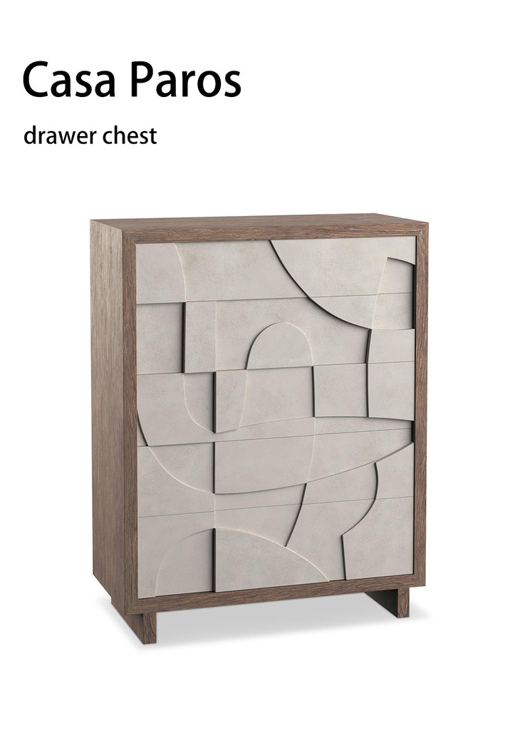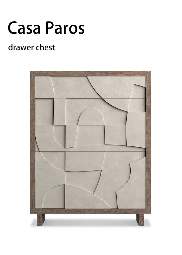 这款Casa Paros斗柜,不规则的立体线条相互交叠,形成了迷人的浮雕美感。冷调仿混凝土纹理抽屉面板,搭配Bedrock仿石纹饰面,与温暖自然木纹饰面形成鲜明对比,营造出精致而质朴的视觉效果。五个按压式开启抽屉,充足的柜子空间,简洁性与功能完美结合,收纳有序�